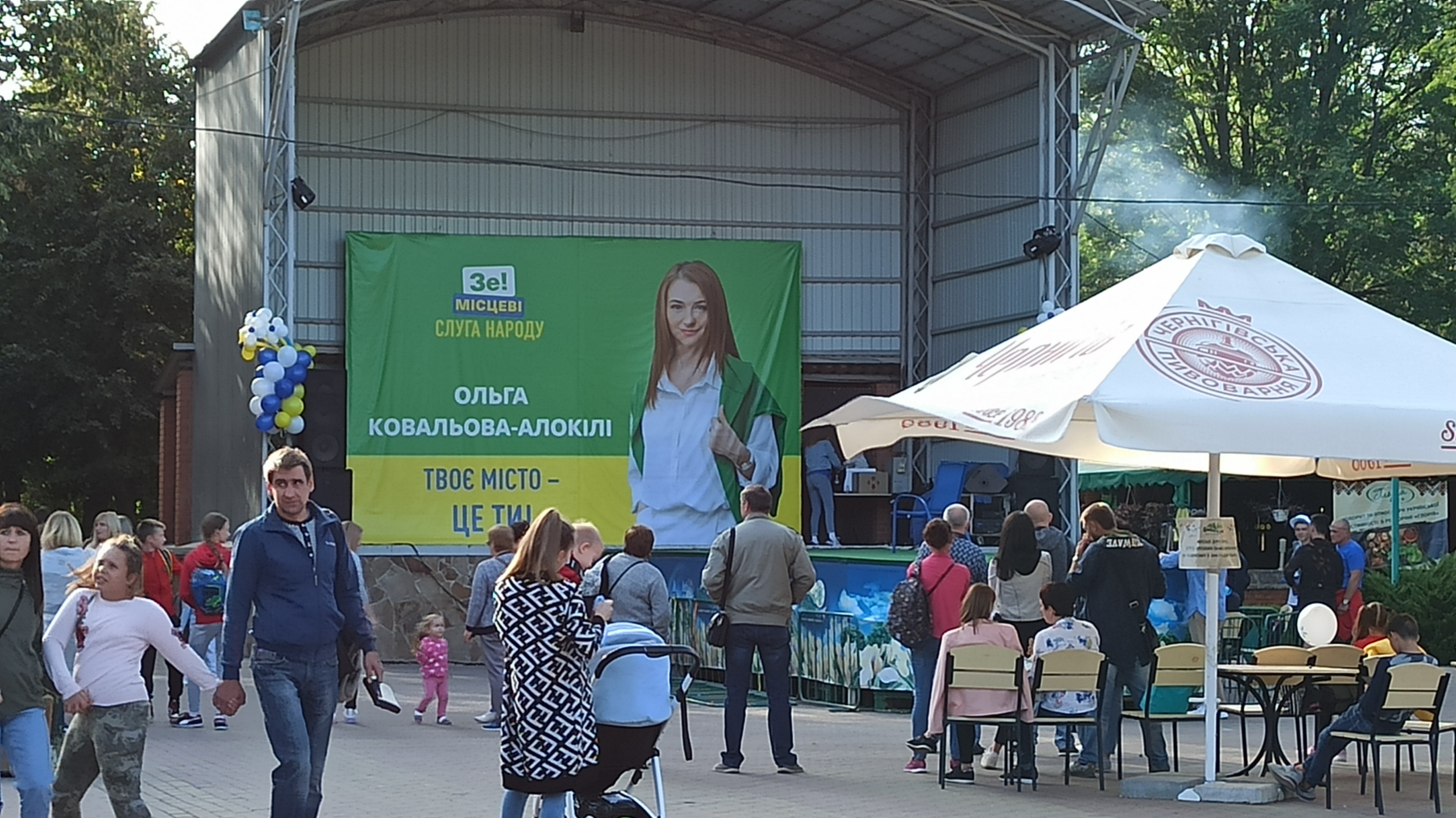 У Дендропарку день міста святкували майстер-класами та концертом. На центральній сцені розмістили банер потенційної кандидатки на посаду міського голови від «Слуги народу» Ольги Ковальової-Алокілі. Фон реклами у традиційному зеленому кольорі та зазначено: «Зе! місцеві вироби. Твоє місто – це ти!». Як повідомляла ОПОРА, у Дендропарку не вперше виставляється цей банер.