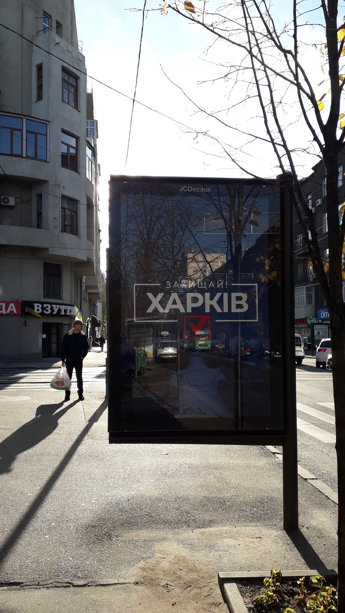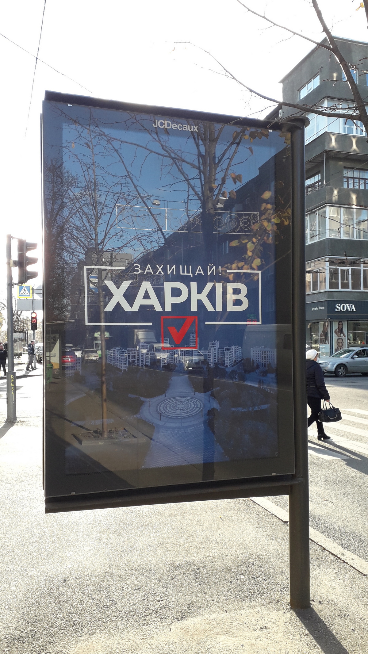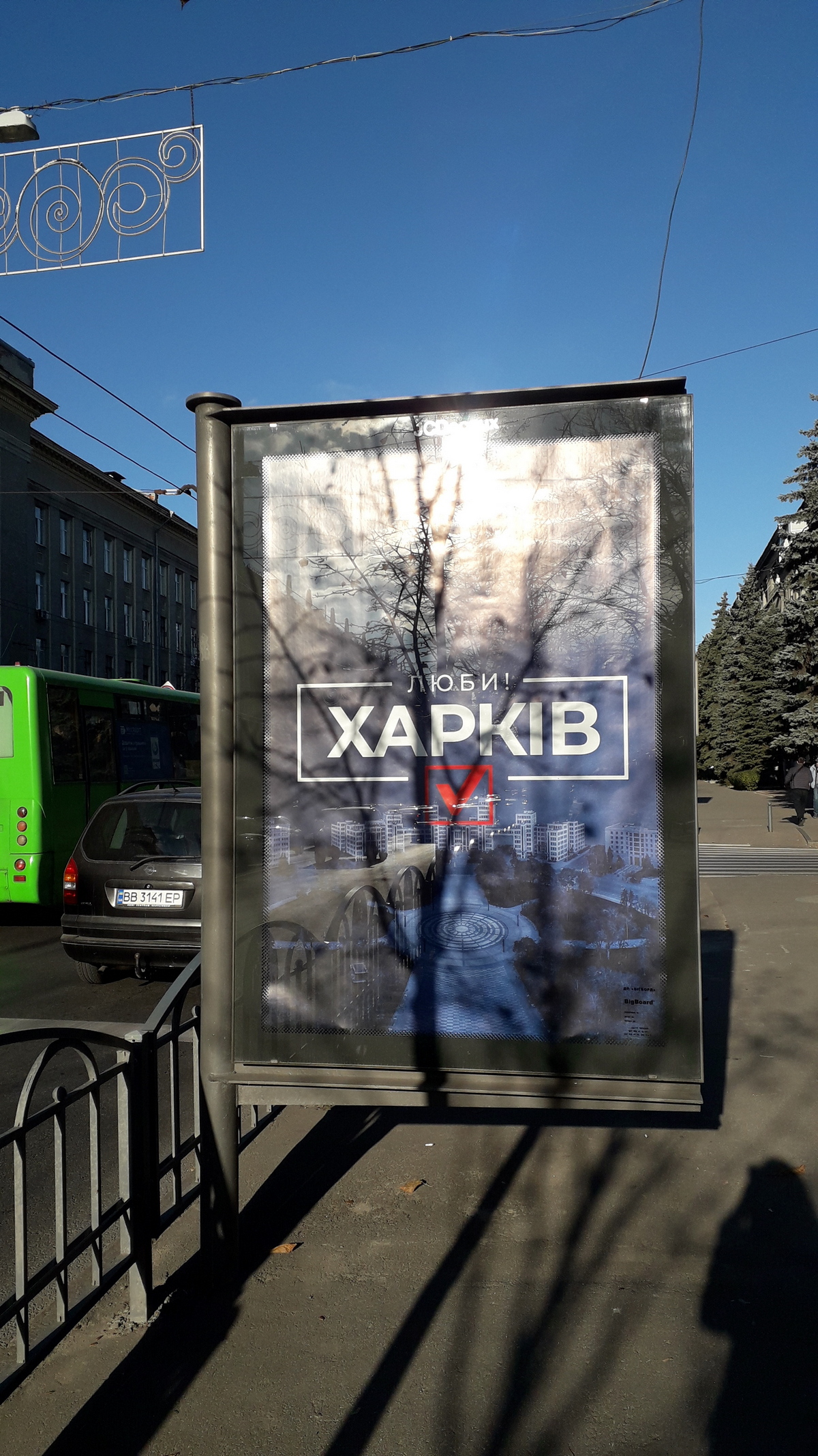 На сітілайтах та бордах темно-синього кольору зображені фотографії міста, на яких є гасла “Люби Харків”, “Захищай Харків”, “Обирай Харків”, “Будуй Харків”. Також була зображена позначка у вигляді “галочки” червоного кольору, яку потрібно поставити у бюлетені.