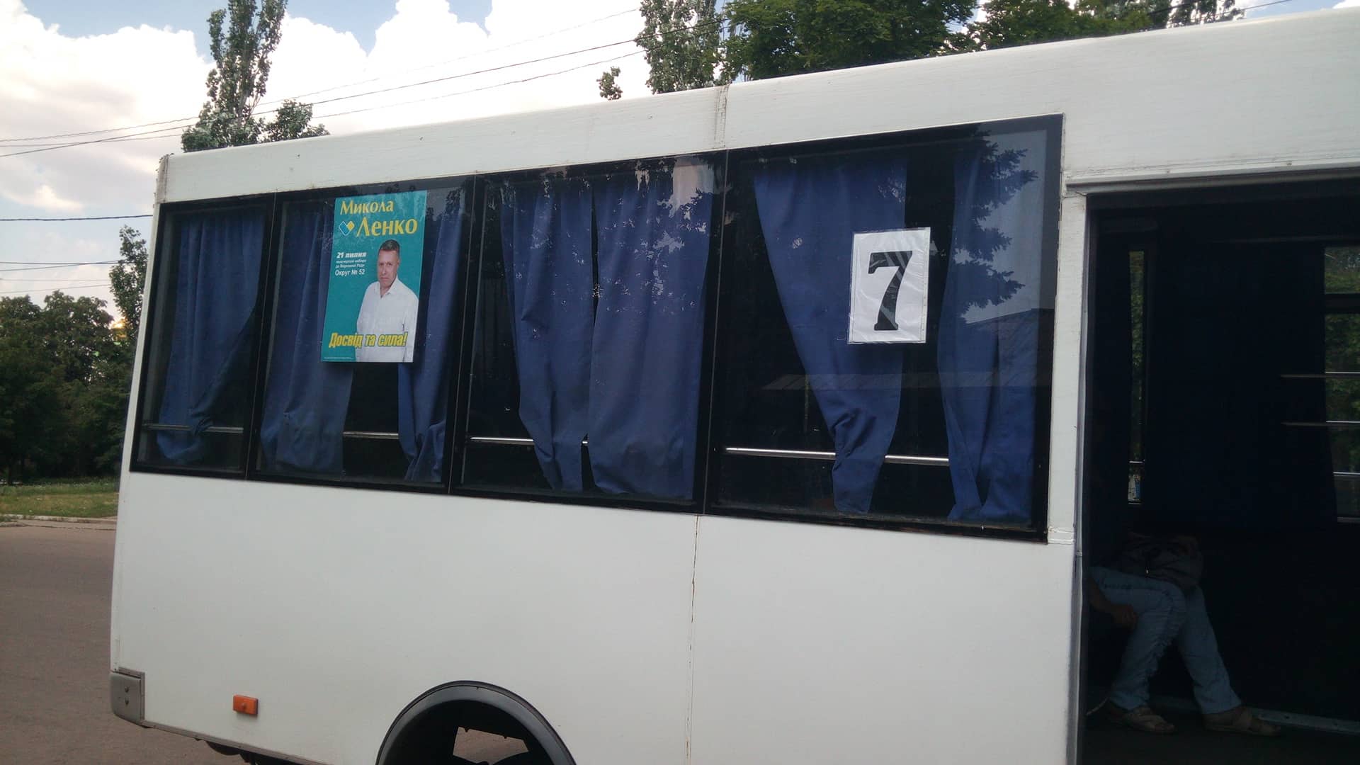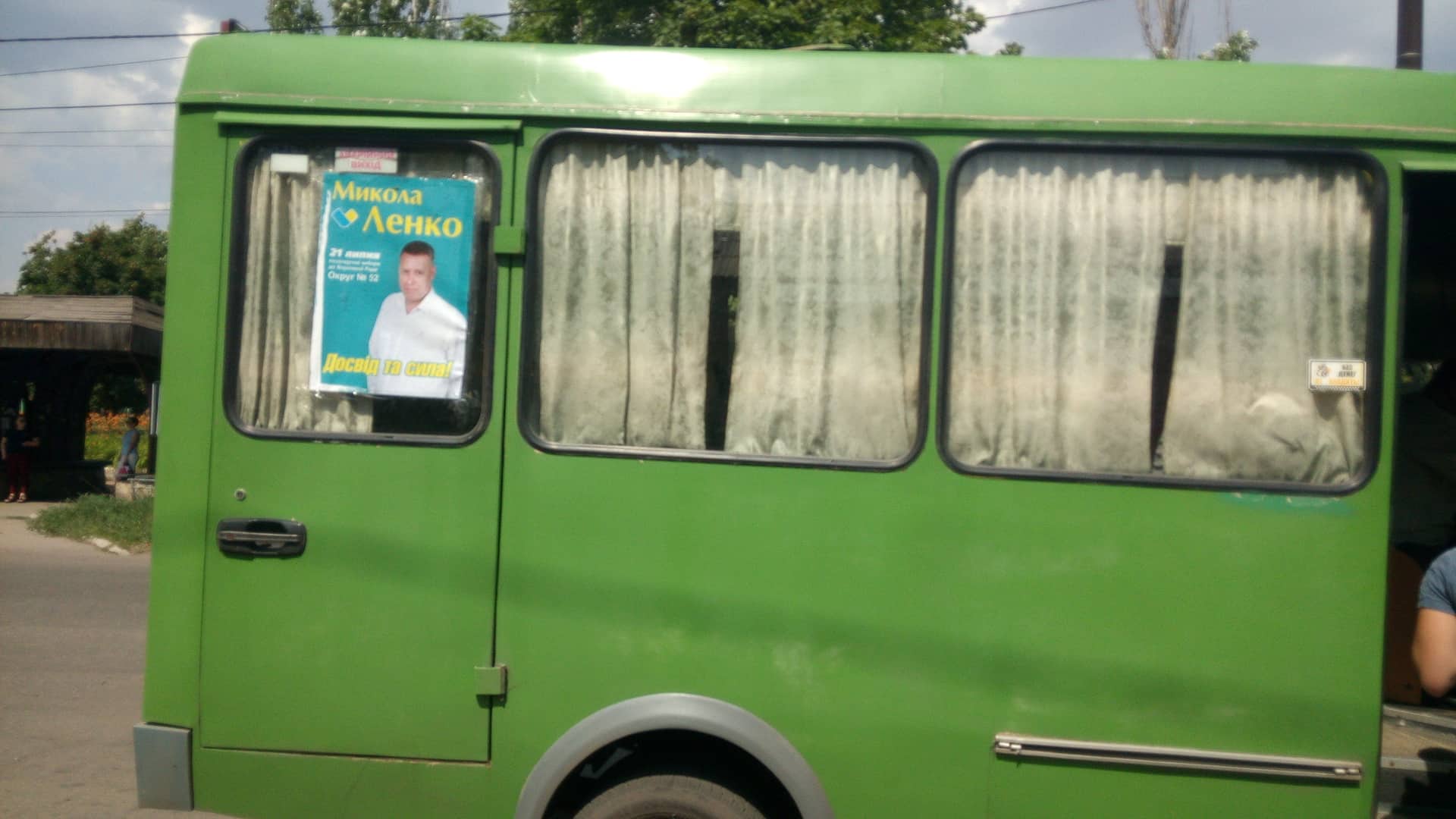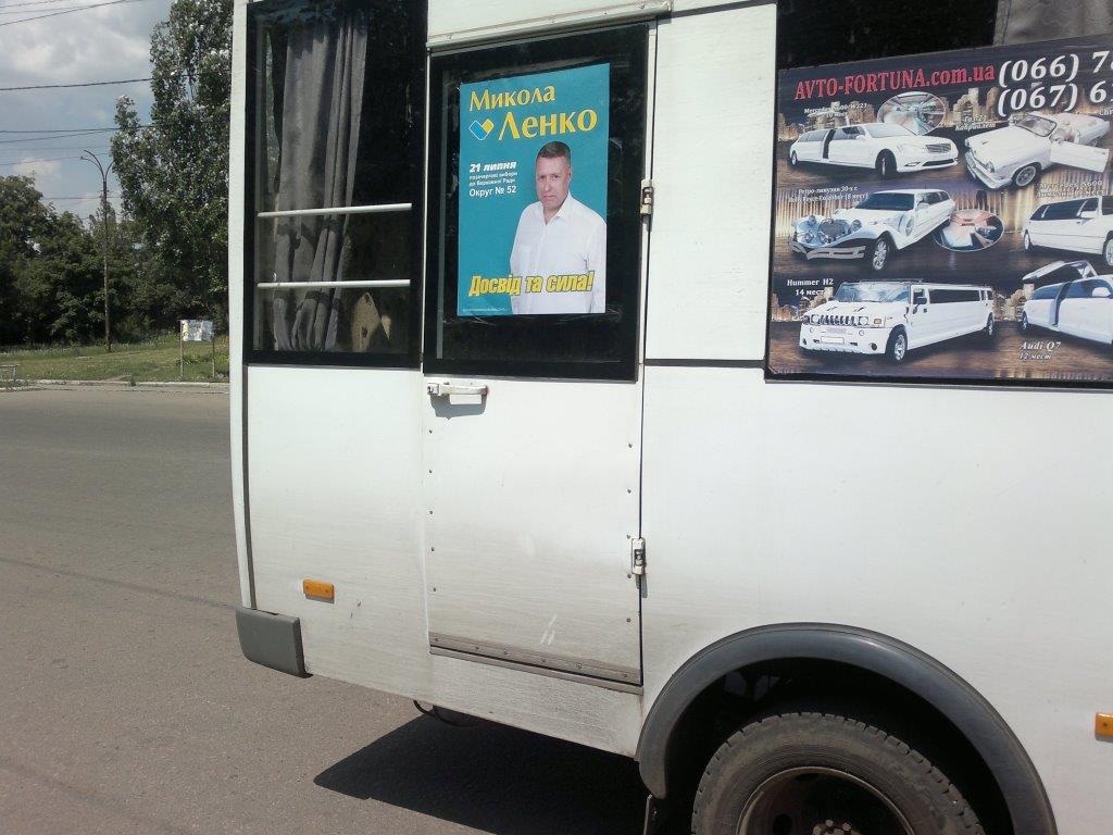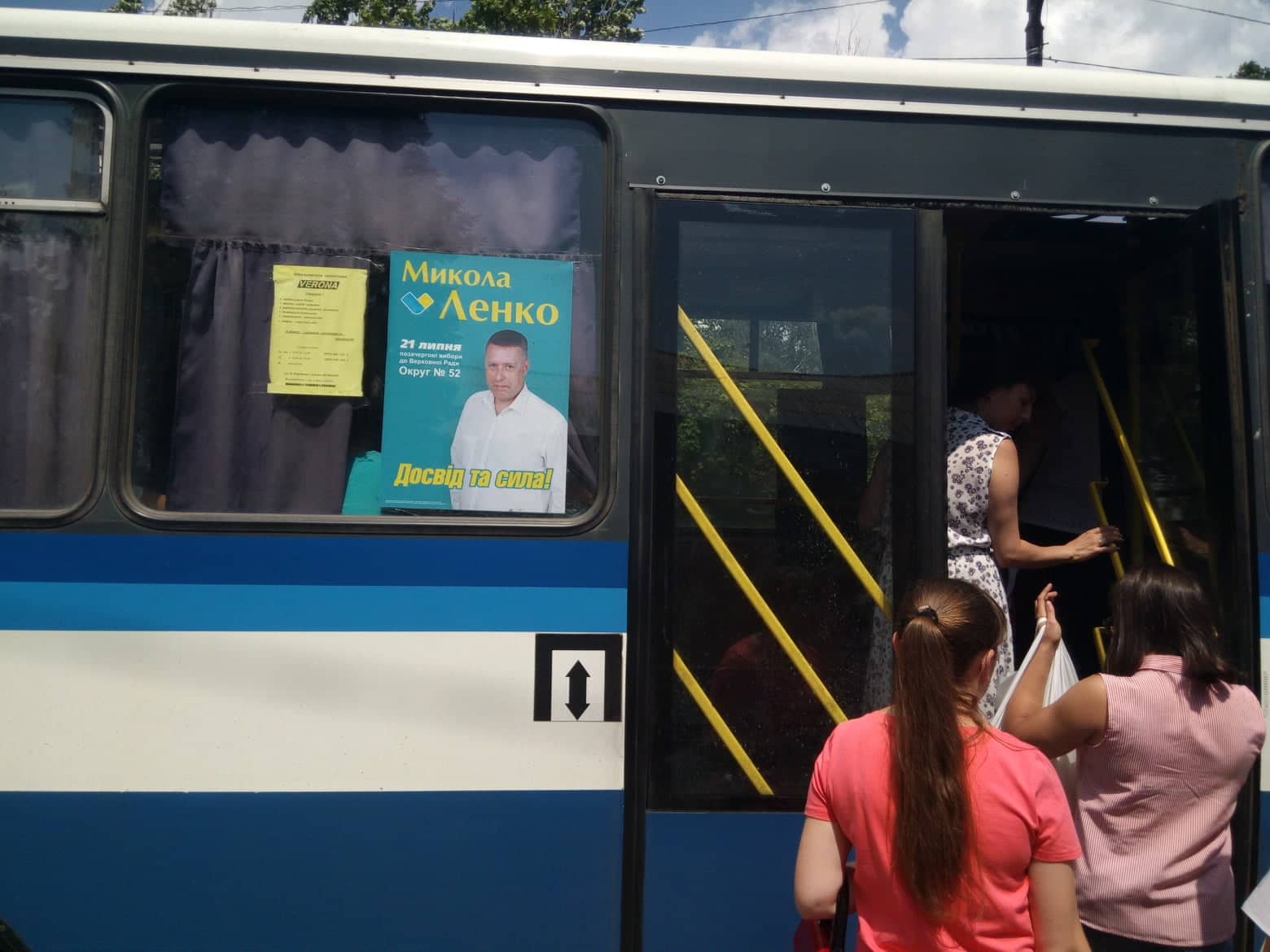 Позавчора, 2 липня у декількох автобусах громадського користування спостерігач виявив плакати агітаційного змісту кандидата в народні депутати у одномандатному виборчому окрузі №52. Друковані матеріали агітації були розміщені на склі автобусів, які здійснюють рейси до селища Новгородське.