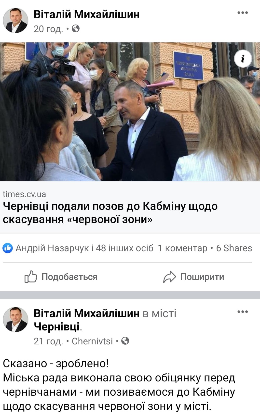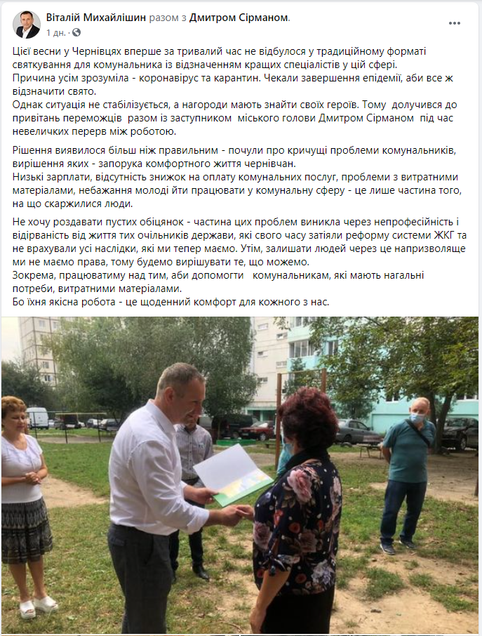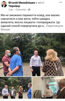 Так, 12 вересня Віталій Михайлішин зустрівся із працівниками лікарні району Садгора, де обіцяв допомогти вирішувати проблеми в галузі медицини та на своїй сторінці у мережі Фейсбук написав про те, сприяв закупці ПЛР-лабораторії для цієї лікарні. 14 вересня, депутат Чернівецької міської ради брав участь у нагородженні працівників житлово-комунальних служб, які перемогли в конкурсі від міської ради. Конкурс, котрий зазвичай проводять у березні, перенесли на вересень і нагороди вручав саме Віталій Михайлішин. Депутат спілкувався із комунальниками і розпитував про їхні проблеми. Окрім того 14 вересня депутат зробив ще один допис на своїй сторінці у фейсбук, де розповів про позов Чернівецької міської ради до Кабінету Міністрів України щодо скасування «червоної зони» у Чернівцях.