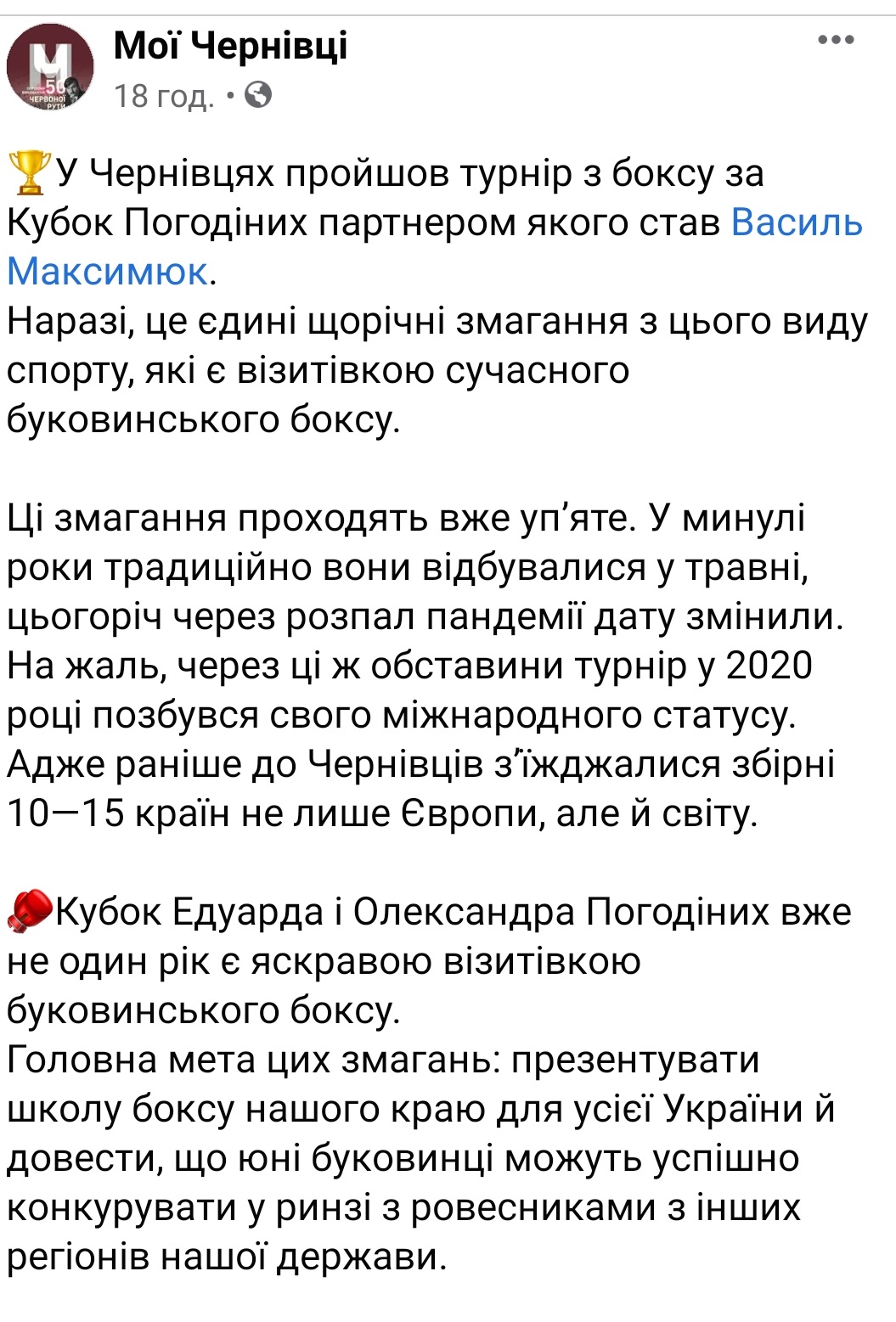Окрім того, ймовірний кандидат у мери Чернівців від “Європейської Солідарності” Василь Максимюк підтримав турнір боксу у Чернівцях. Про те, яку саме підтримку надав кандидат у проведенні цього заходу, спостерігачам ОПОРИ організатори так і не відповіли.