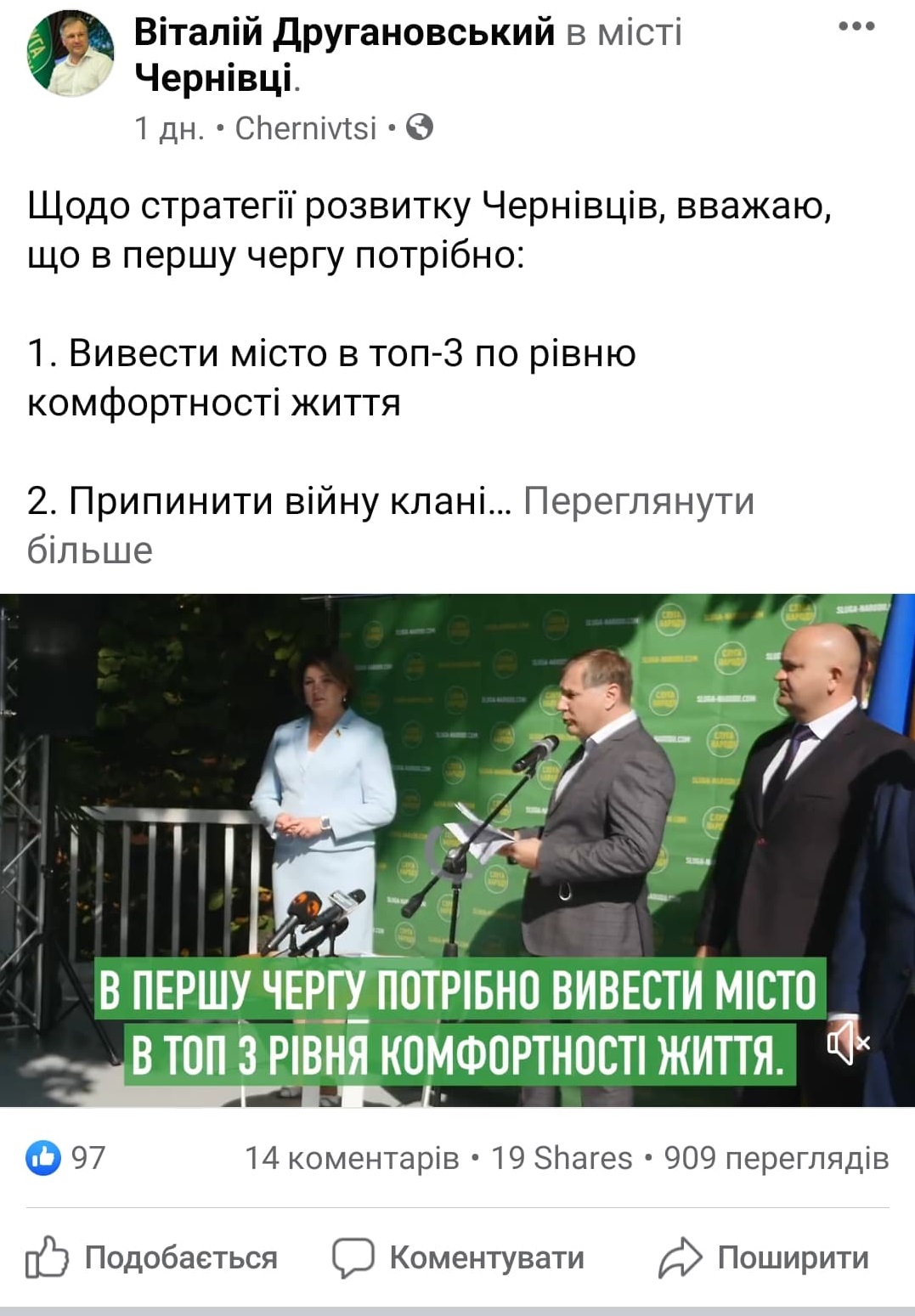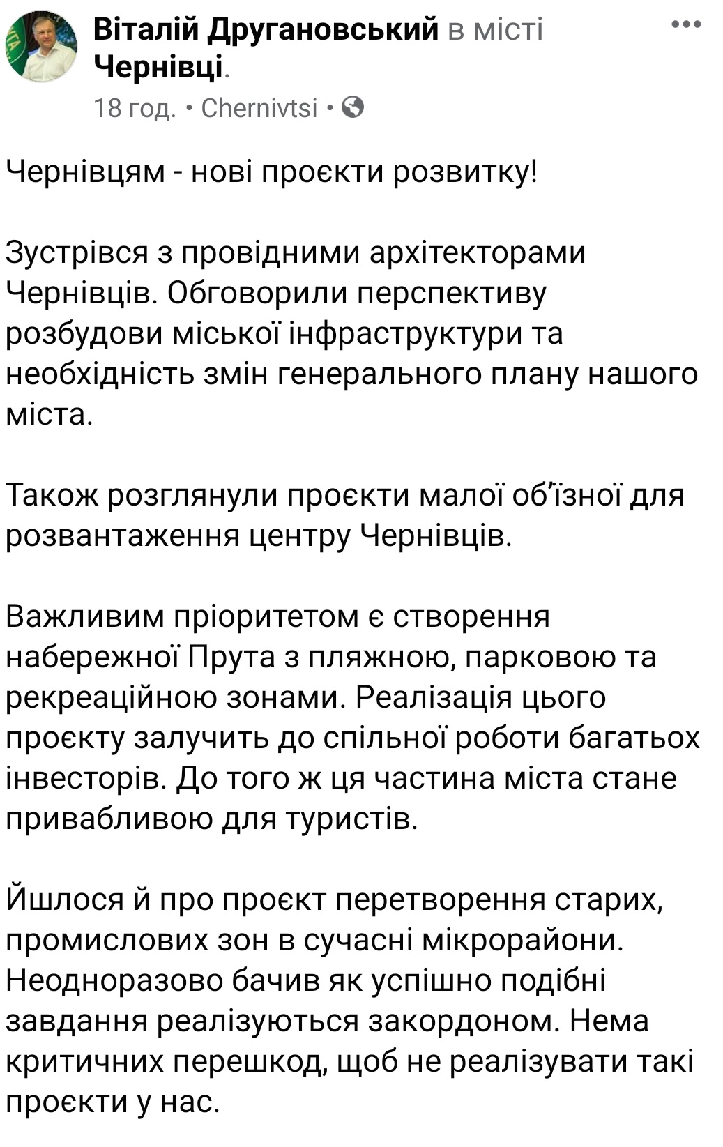 Ще один потенційний кандидат у мери міста Чернівці, який проявляє активність, – це Віталій Другановський від партії «Слуга народу». Нещодавно він презентував стратегію розвитку міста, на заході була присутня і Олена Лис, депутатка Верховної Ради, обрана від «Слуги народу» (201 округ). А 14 вересня Віталій Другановський зустрівся із архітекторами, про це відомо з його допису на своїй сторінці у фейсбуці. З ними політик обговорював майбутню стратегію розвитку міста.