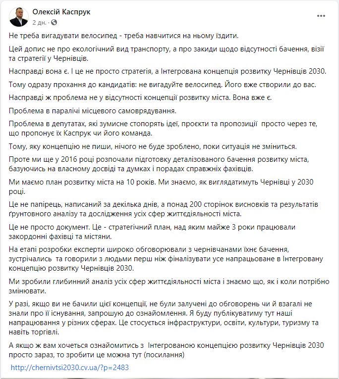 Разом з тим, потенційний кандидат на посаду міського голови від політичної партії “Пропозиція” Олексій Каспрук заперечив у своєму дописі відсутність у Чернівцях стратегії розвитку, апелюючи до того, що в час його роботи на посаді вже розробили документ під назвою “Інтегрована концепція розвитку Чернівців”.