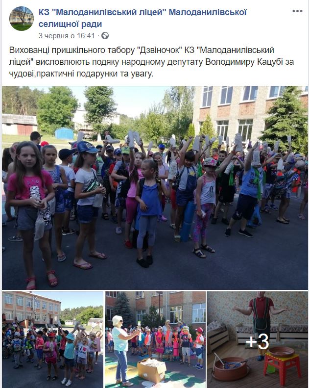 Вихованці пришкільного табору «Дзвіночок» Малоданилівського ліцею Малоданилівської селищної ради до 1 червня отримали від нардепа Володимира Кацуби пляшечки для напоїв. Схожі пляшечки можна купити за ціною від 64 до 124 гривень.