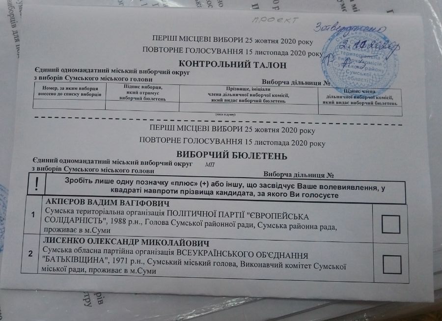 Голова Сумської міської ТВК Ірина Гончаренко повідомила ОПОРІ, що текст бюлетеня для голосування у «другому турі» на виборах міського голови Сум вже затверджено. За її словами, ДВК мають отримати бюлетені в п’ятницю перед днем голосування.