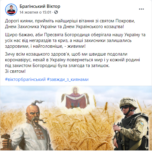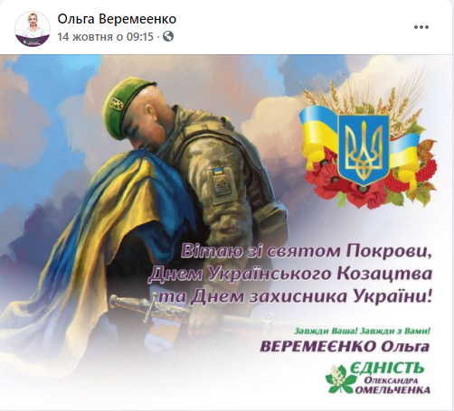 Аналізуючи дописи кандидатів у депутати Київради, які вони розмістили у Facebook з нагоди Дня захисника України, який святкуємо в день релігійного свята Покрови Пресвятої Богородиці водночас з Днем українського козацтва, можемо виокремити кілька типів активностей: власне агітація; свята для дітей, що супроводжувалися агітацією; допомога воїнам і вшанування пам’яті полеглих (з обов’язковим афішуванням назв добросердих політичних сил чи хоча б транслюванням їхніх упізнаваних гасел) і, нарешті, поширення вітальних листівок з партійними логотипами.
