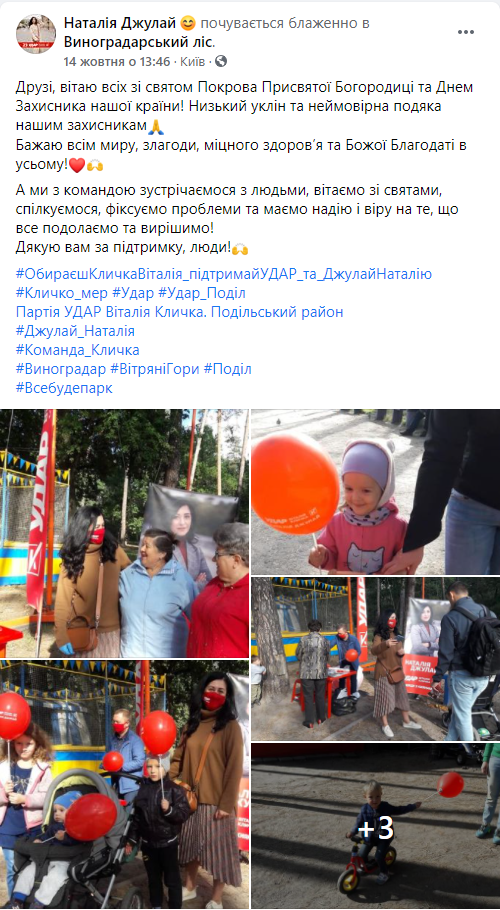 Безпосередньо для агітації використала свято кандидатка в депутати від партії «УДАР» Наталія Джулай: «А ми з командою зустрічаємося з людьми, вітаємо зі святами, спілкуємося, фіксуємо проблеми та маємо надію і віру на те, що все подолаємо та вирішимо!» – написала вона на своїй сторінці в Facebook. На фото, які оприлюднила кандидатка, видно партійну символіку на кульках, банері, масці. Крім того, у дописі використано пов’язані з виборами хештеги: #ОбираєшКличкаВіталія_підтримайУДАР_та_ДжулайНаталію, #Кличко_мер #Удар #Удар_Поділ, #Команда_Кличка.