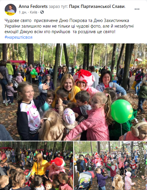 Ганна Федорець, яка балотується до Київради від партії «Перемога Пальчевського», День захисника України святкувала у Парку партизанської слави в брендованому партійною символікою одязі. Як видно з фото на сторінці Ганни Федорець, вона побувала на дитячому святі, де малюків розважала аніматорка. «Чудове свято присвячене Дню Покрова та Дню Захистиника України залишило нам не тільки ці чудові фото, але й незабутні емоції! Дякую всім хто прийшов та розділив це свято!» – поділилася емоціями кандидатка.