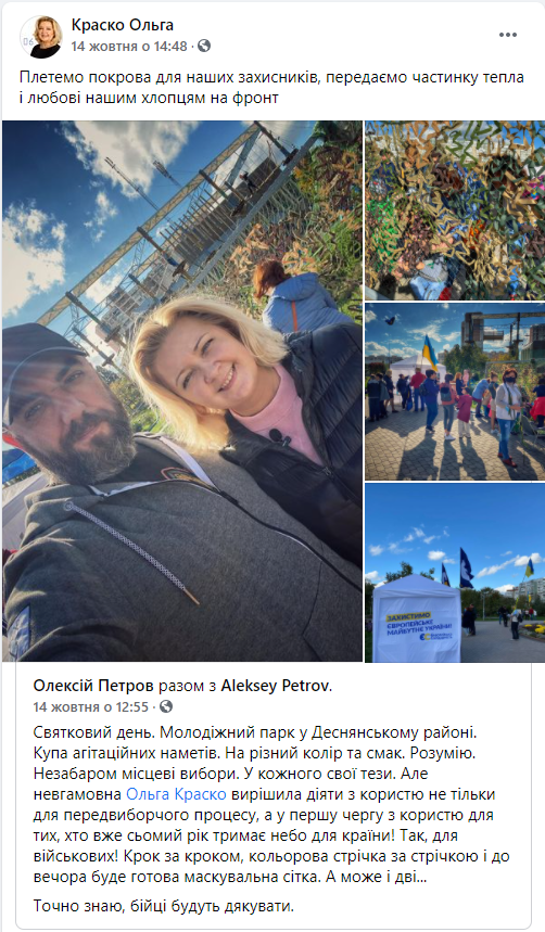 Кандидатка в депутати до Київської міської ради Ольга Краско поширила допис зі сторінки користувача Олексія Петрова про те, що вона «вирішила діяти з користю не тільки для передвиборчого процесу, а у першу чергу з користю для тих, хто вже сьомий рік тримає небо для країни!» Сама ж кандидатка написала: «Плетемо покрова для наших захисників, передаємо частинку тепла і любові нашим хлопцям на фронт».