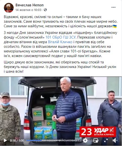 Заступник голови КМДА Вячеслав Непоп, який також балотується у депутати Київської міської ради від партії «УДАР», у День захисника України відвідав «підшефну» благодійному фонду «Солом'янський» 101 ОБрО ГШ ЗСУ. Переказав хлопцям і дівчатам вітання від мера Віталія Кличка і привітав від себе особисто». А відтак використав візит до військових для агітаційного ролика партії «УДАР», у якому, зокрема, зазначив: «Ще з 2014 року столична влада, мер Києва та я особисто, підтримували наших військових та їх родини і досьогодні підтримуємо атовців матеріальною допомогою. Разом з вами ми вшанували пам’ять загиблих вашої бригади, побудувавши меморіальний комплекс «Алея слави 101 бригади».