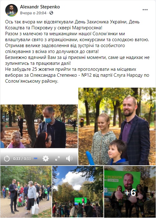 Так, до прикладу, в Солом’янському районі Києва кандидат у депутати міської ради від партії «Слуга народу» Олександр Степенко святкував День козацтва в сквері Мартиросяна. «Разом з малечою та мешканцями нашої Солом’янки ми влаштували свято з атракціонами, конкурсами та солодкою ватою. Отримав велике задоволення від зустрічі та особистого спілкування з всіма хто долучився до свята!» – написав кандидат на своїй сторінці в Facebook.
