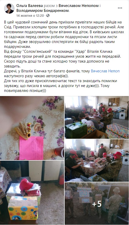 Кандидатка у депутати Київради від партії «УДАР» Ольга Валєєва 14 жовтня прозвітувала на своїй сторінці у Facebook про поїздку на Схід. «Від фонду «Солом'янський» та команди «Удар» Віталія Кличка передали трохи речей для покращення умов життя на передовій. Скоро підуть дощі та стане холодно тому така допомога не завадить», – зазначила Ольга Валєєва, а також виклала кілька фото, що рясніли партійною символікою.