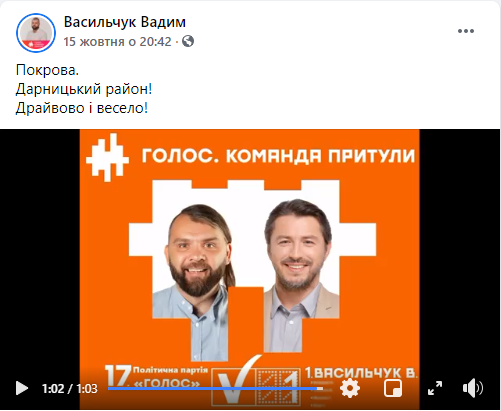 Кандидат у депутати Київради від партії «Голос» Вадим Васильчук розмістив на своїй сторінці відео святкування, ймовірно, організованого самим кандидатом, у Дарницькому районі. Здебільшого розваги зацікавили дітей. Про це свідчить ролик, в якому помітно багато партійної символіки (банери кандидата в оформленні сцени, сумка з логотипом, брендовані фото). Завершується ролик агітаційною заставкою.