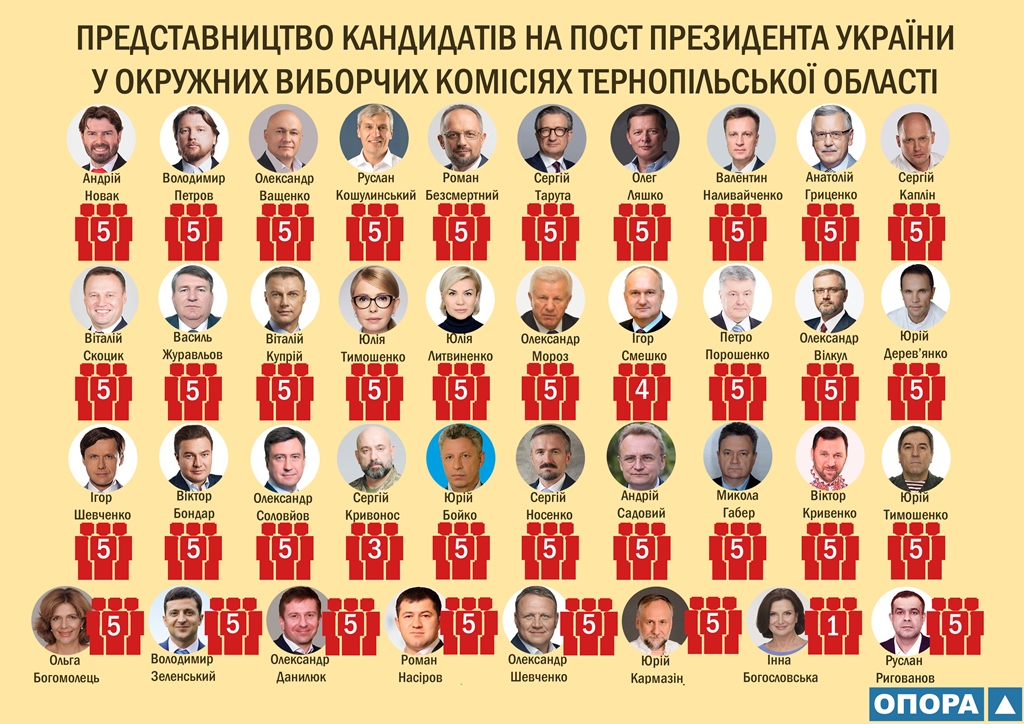ОПОРА нагадує, що Центральна виборча комісія зареєструвала 44 кандидати на посаду Глави держави. В Тернопільській області голосування мешканців на чергових виборах буде організовано на 5 територіальних виборчих округах (№163-167). Так, кількісний склад окружних виборчих комісій в межах регіону нараховує 183 особи. Комісії у ТВО №163 та 167 мають по 36 членів, а у ТВО №164,165 та 166 – по 37 членів.