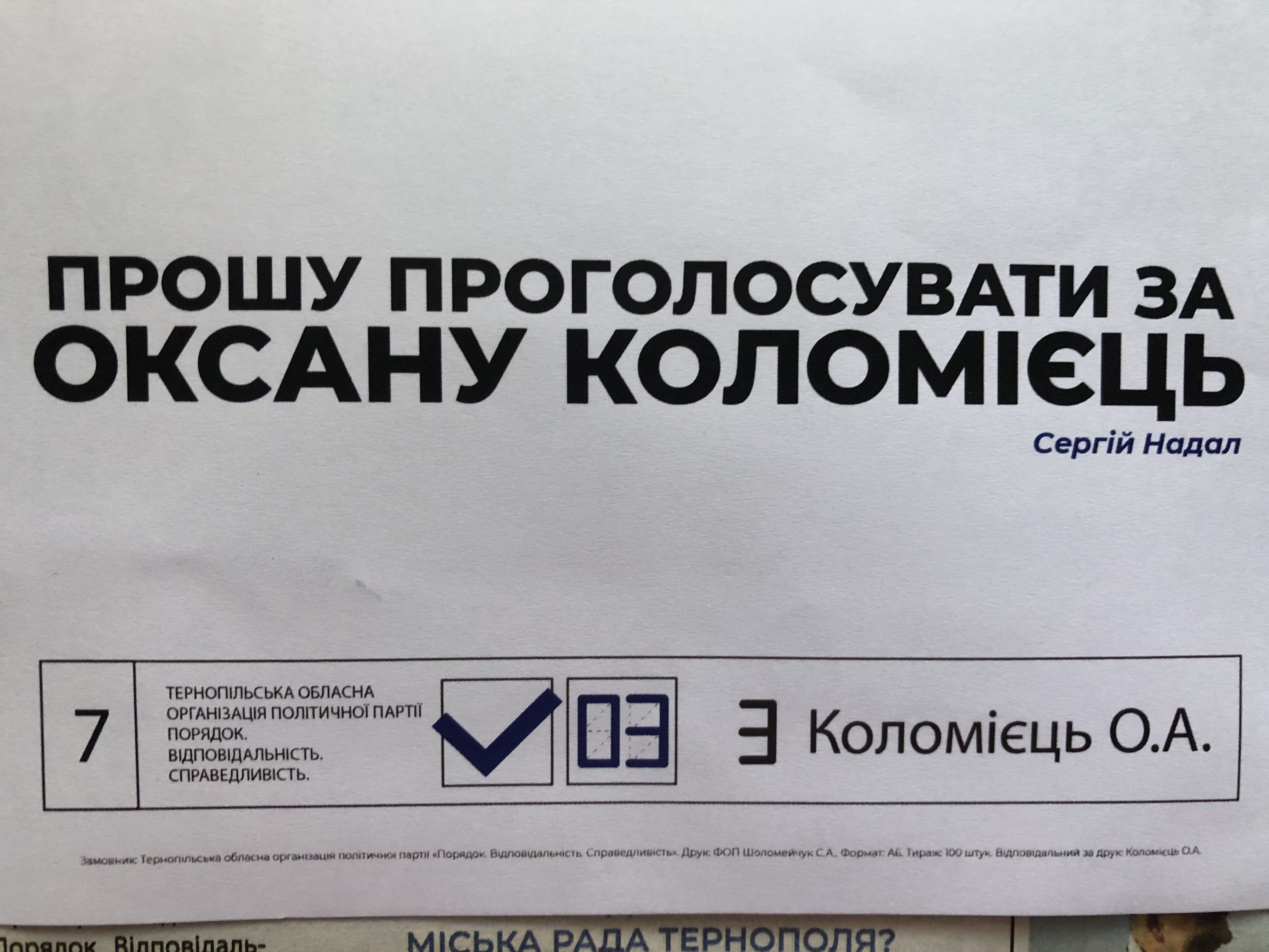 22 жовтня на спортивному майданчику на вулиці Чалдаєва по завершенню спортивного свята хлопець роздавав флаєри на безкоштовну піцу разом із агітаційними матеріалами кандидата до Тернопільської міської ради Дмитра Синюти. Крім цього 22 жовтня на вулиці Чернівецька людина похилого віку отримала «мобільну аптечку виборця» разом з друкованими агітаційними матеріалами партії «Порядок. Відповідальність. Справедливість» та кандидатки у депутати до Тернопільської міської ради Оксани Коломієць.