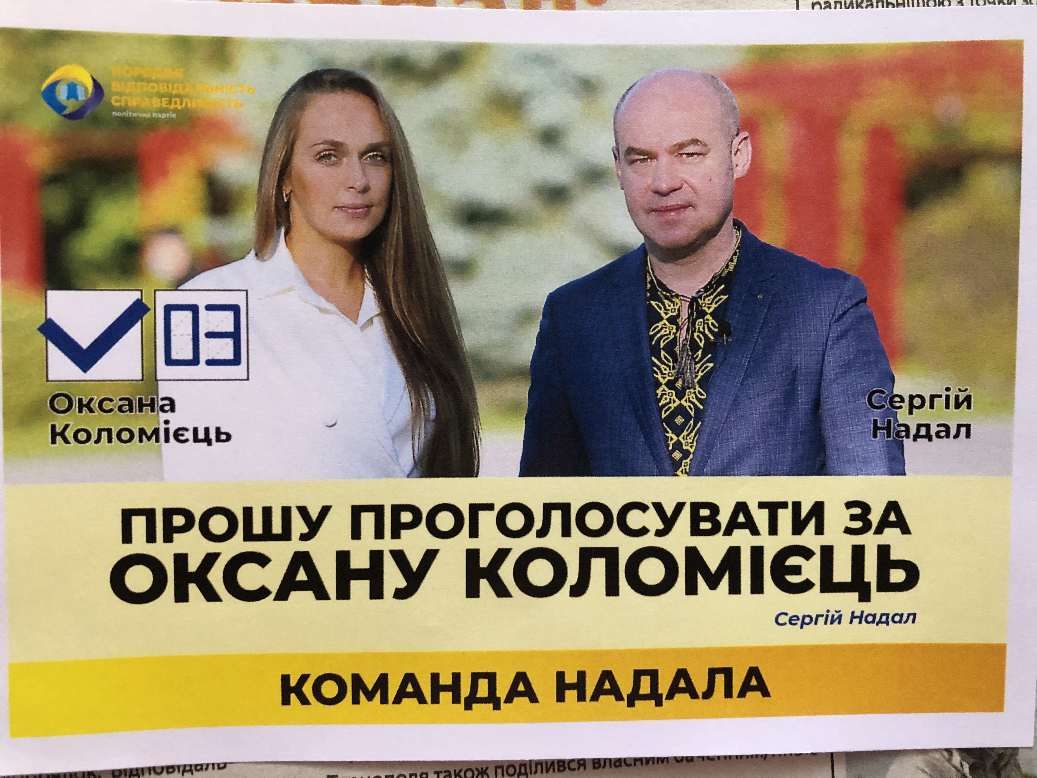 Крім цього люди, які принесли набір дали газету партії «Порядок. Відповідальність. Справедливість» та агітку кандидатки у депутати до Тернопільської міської ради від цієї політичної сили Оксани Коломієць, вказавши, що це кандидатка закупила такі аптечки для виборців.