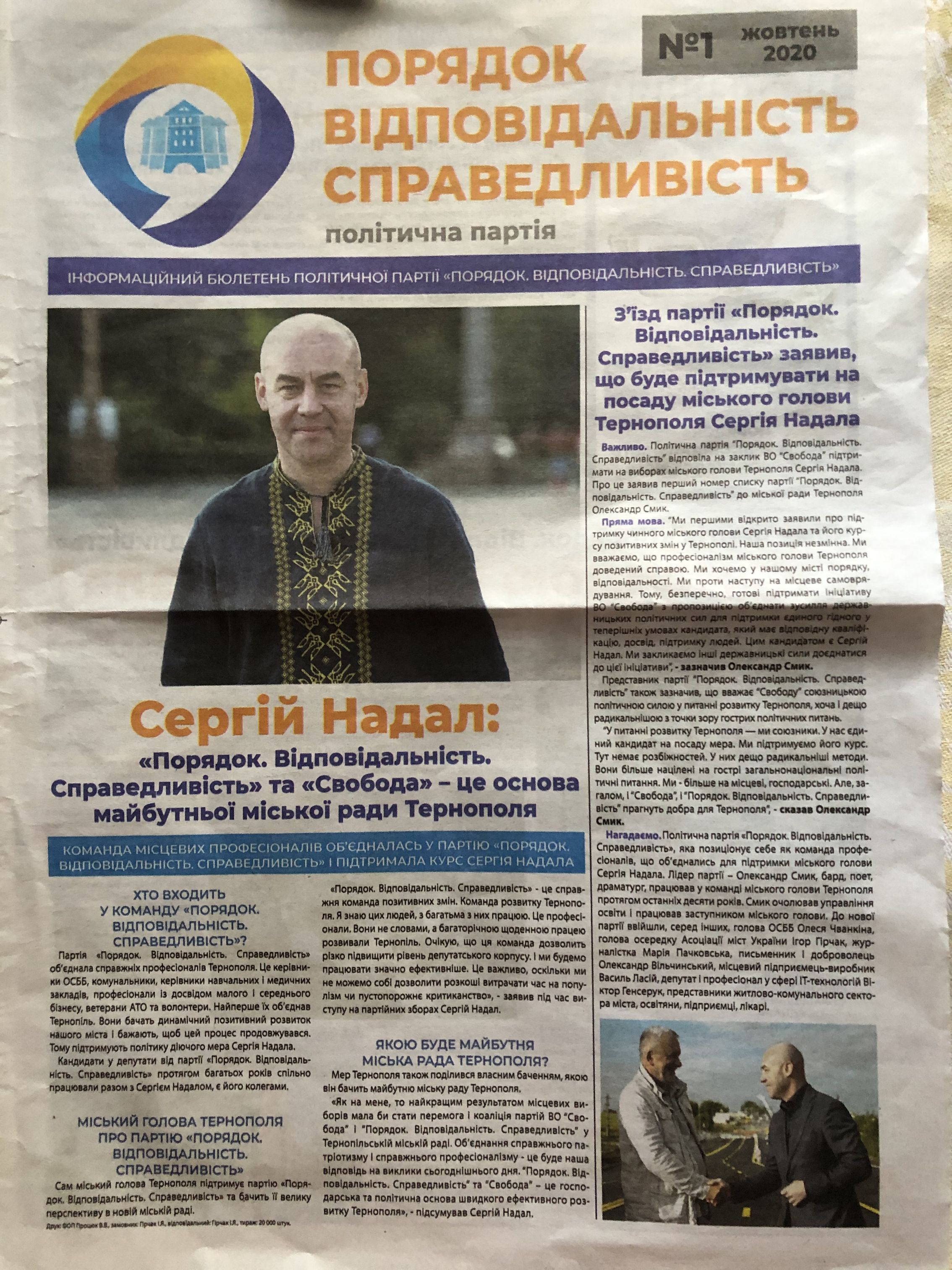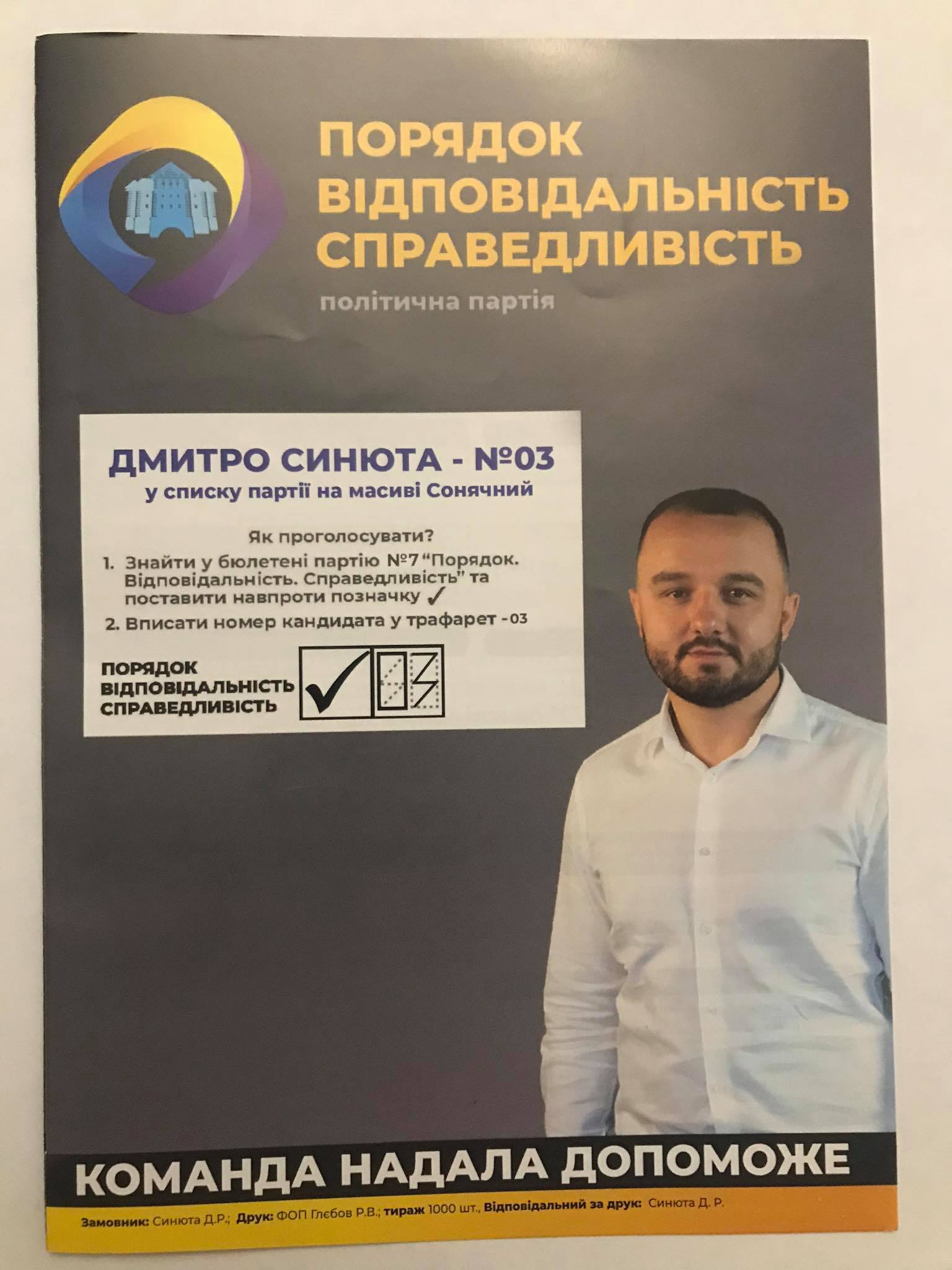 22 жовтня на кількох спортивних майданчиках у місті Тернополі проходив футбольний Кубок. В рамках цього заходу, на майданчику на вулиці Чалдаєва відбулося спортивне свято, по завершенні якого хлопець роздавав флаєри на безкоштовну піцу разом із агітаційними матеріалами кандидата до Тернопільської міської ради від партії «Порядок. Відповідальність. Справедливість» Дмитра Синюти.