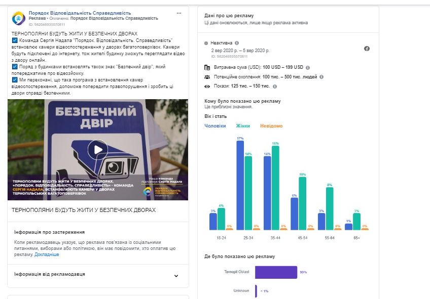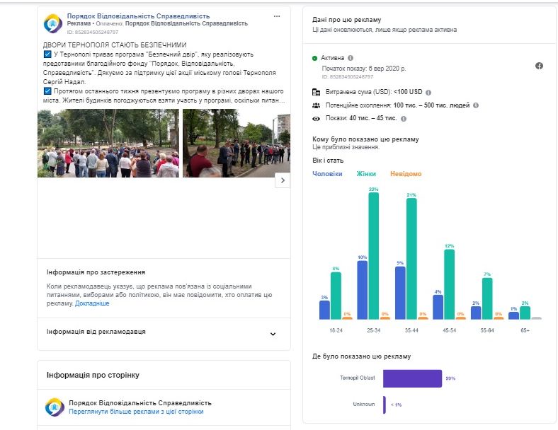 У рекламному дописі, який був запущений 6 вересня, йшлося: «У Тернополі триває програма «Безпечний двір», яку реалізовують представники благодійного фонду «Порядок, Відповідальність, Справедливість». Дякуємо за підтримку цієї акції міському голові Тернополя Сергію Надалу». Витрачена сума становила менше 100 доларів.