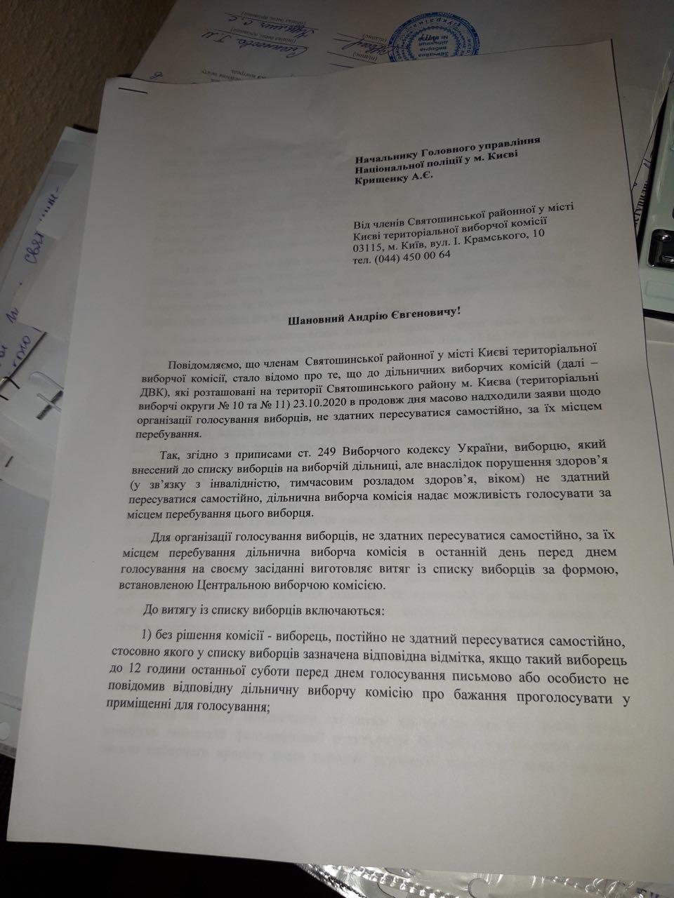 Про начебто масове надходження до дільничних виборчих комісій заяв виборців, у яких вони просили забезпечити їм голосування за місцем перебування, 24 жовтня до поліції повідомили 10 членів Святошинської ТВК.