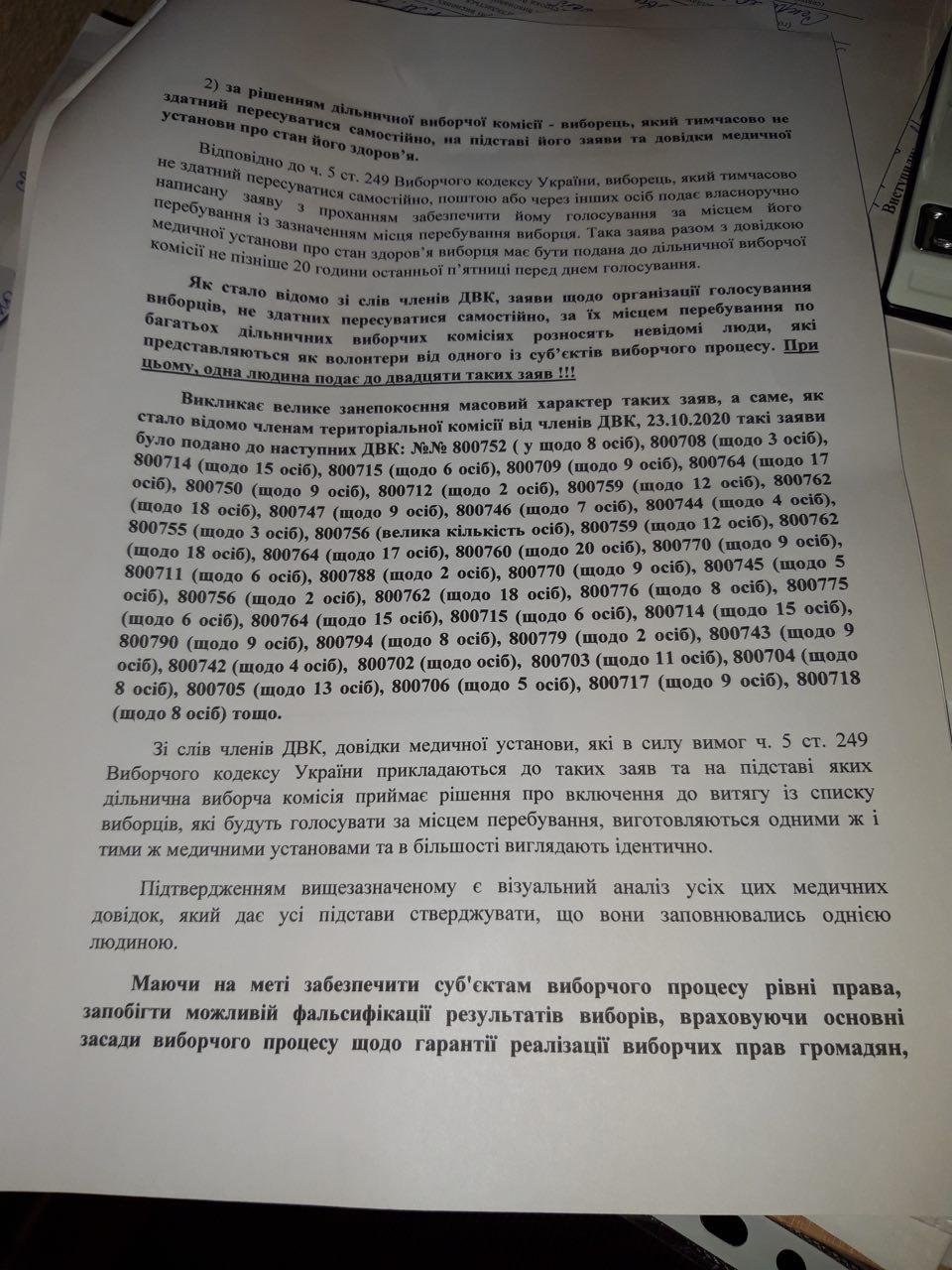 Відповідно до інформації, викладеної в їхній заяві, від членів ДВК у Святошинському районі міста Києва (ТВО №10 та ТВО №11) в ТВК дізналися, що 23 жовтня декілька невідомих людей, які представлялися волонтерами “від одного з суб’єктів виборчого процесу”, приносили до багатьох ДВК заяви щодо організації голосування виборців, не здатних пересуватися самостійно, за їх місцем перебування, при цьому одна людина подавала до 20 таких заяв. Крім того, члени ДВК стверджували, що медичні довідки, додані до заяв, “виготовляються одними ж і тими ж медичними установами та в більшості виглядають ідентично”.