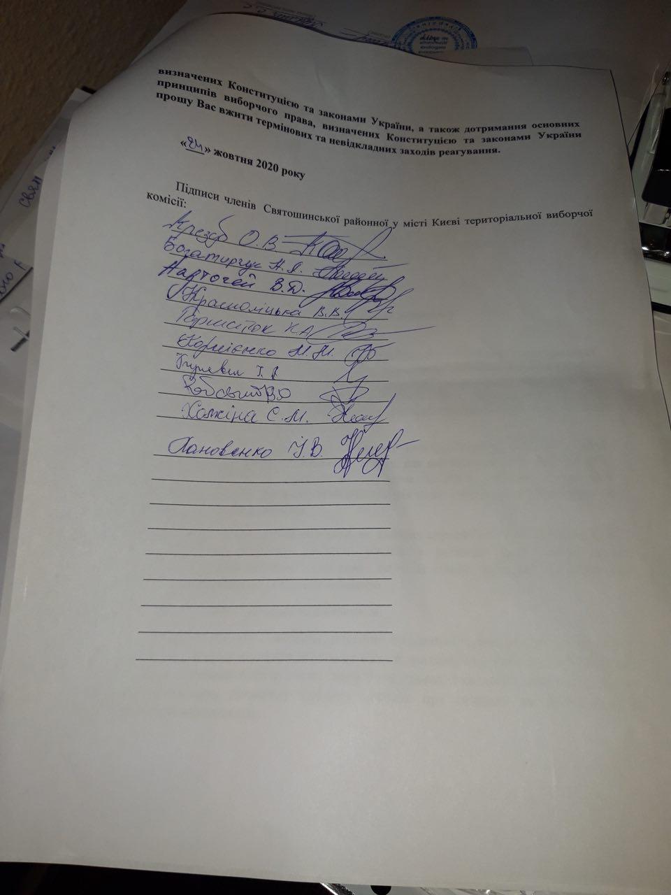 Напередодні виборів, 24 жовтня, члени Святошинської ТВК звернулися до поліції з приводу можливої підробки громадянами медичних довідок для голосування вдома. В поліції ОПОРІ повідомили, що проводиться перевірка, за результатами якої буде надана правова кваліфікація цій події.