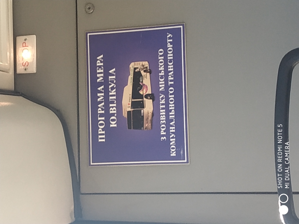 В цьому автобусі висить табличка, на якій написано: «Програма мера Ю. Вілкула з розвитку міського комунального транспорту».
