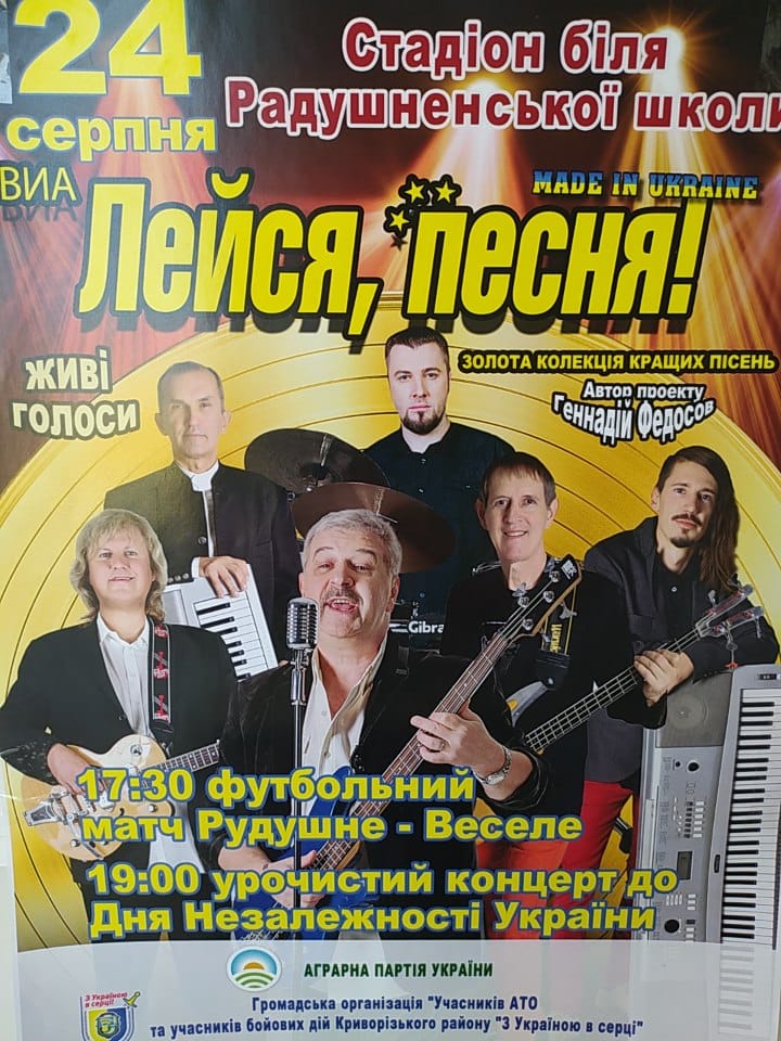 Також на 24 серпня в смт Радушне був анонсований захід - футбольний матч і концерт за підтримки Аграрної партії України. Він не відбувся через лист голови селищної ради, в якому рекомендується утриматися від проведення масових заходів в умовах карантину.