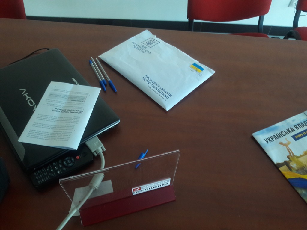 Спостерігачі ОПОРИ у «прозорому офісі» зафіксували також календарі з портретом Порошенка та лист від Ради регіонального розвитку. А також бачили в офісах брошури «Українська влада. Вчора та сьогодні» (авторський колектив – ГО «Інститут розвитку і сприяння демократії», автор видання –  Іван Добровольський. Тираж 500 екз. Підготовлено у 2018 р.). ОПОРА уже писала про ГО «Інститут розвитку і сприяння демократії» – ймовірного організатора «соціологічного опитування щодо ставлення до ситуації в Україні», одним із завдань якого було виявлення прихильників чинного Президента. Спостерігачі ОПОРИ зафіксували офіси цієї громадської організації у районних центрах Кіровоградщини.