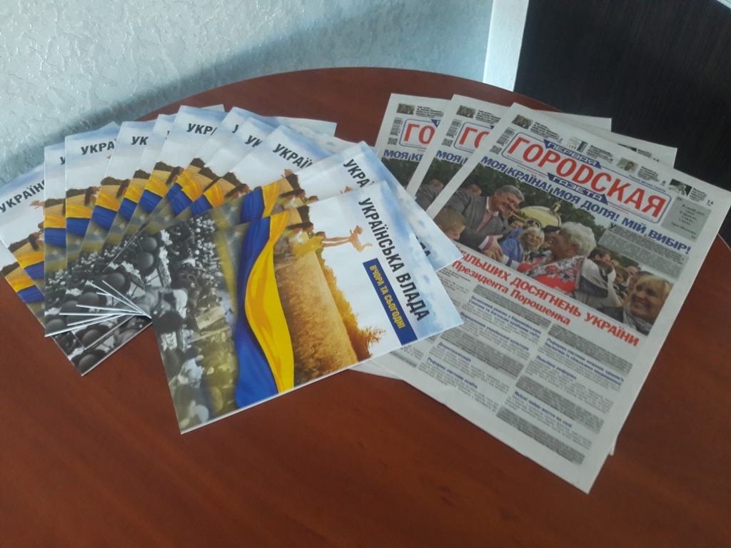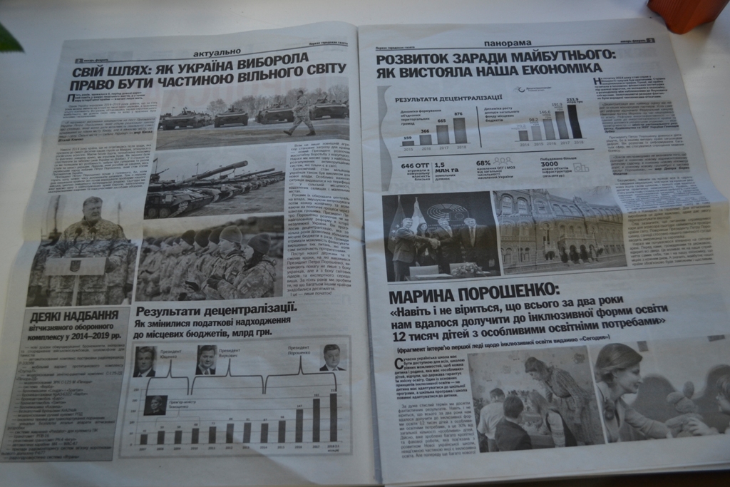 У «відкритому офісі» газета  «Первая городская газета» лежала на підвіконі та стелажах. Більшість матеріалів спецвипуску присвячені Петру Порошенку, його досягненням на посту Президента України в різних сферах («10 найбільших досягнень України за часів Президента Порошенка», «Свій шлях: як Україна виборола право бути частиною вільного світу», «Розвиток заради майбутнього: як вистояла наша економіка», «Петро Порошенко та Кіровоградщина: відкриття дитячої обласної лікарні, привітання з 264-річчям та інклюзивнаосвіта»). Окремі публікації містять схвальні відгуки відомих людей про діяльність чинного Президента («Громадські активісти Кіровоградщини приєдналися до «команди Порошенка»). На останній сторінці розміщений рецепт млинців від дружини кандидата у Президенти Марини Порошенко.