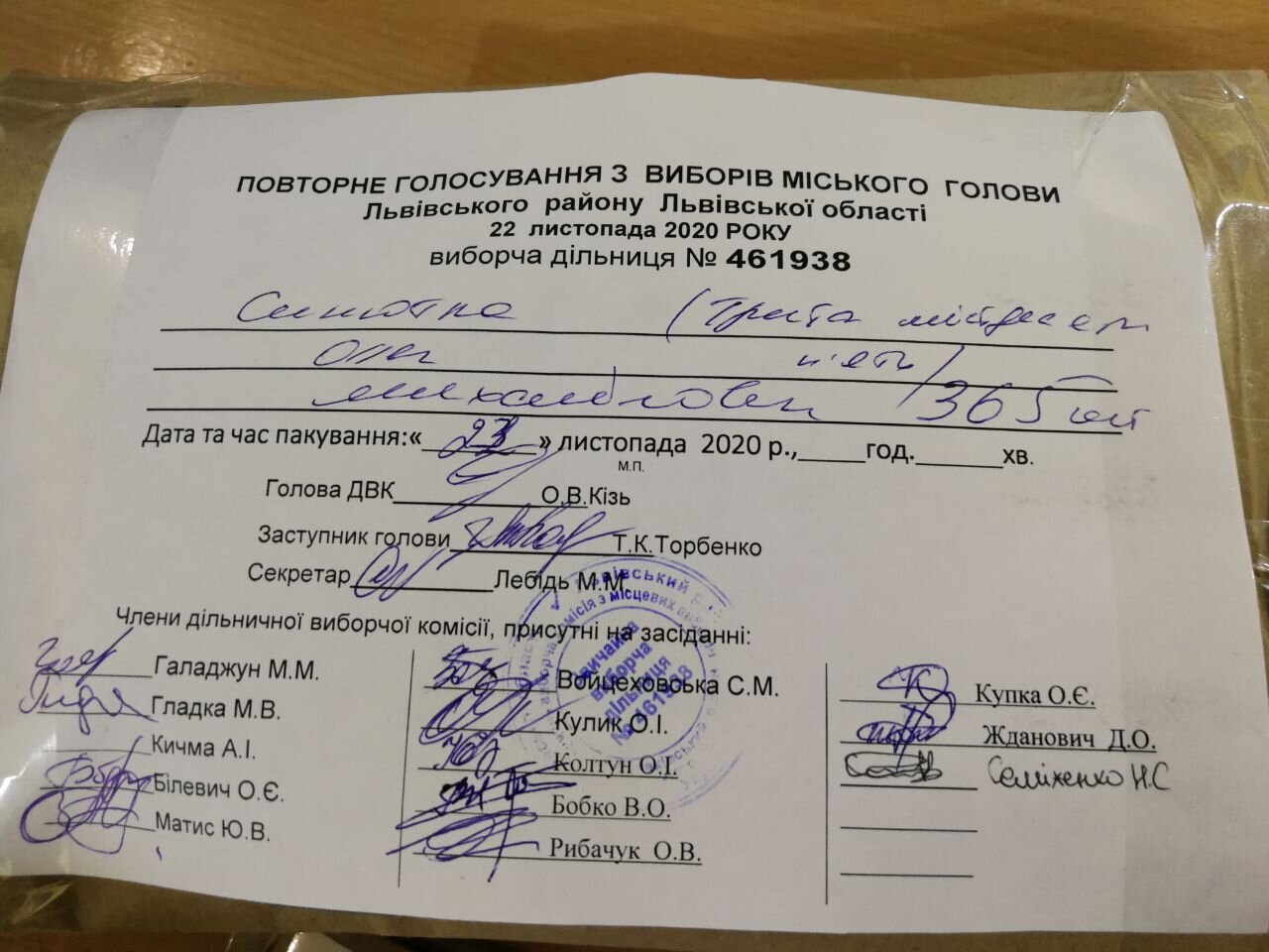 Натомість члени дільничної виборчої комісії №461938 підписали протокол і пакет з результатами голосування за одного з кандидатів “з майбутнього”. На документах вказана лише дата 23 листопада.