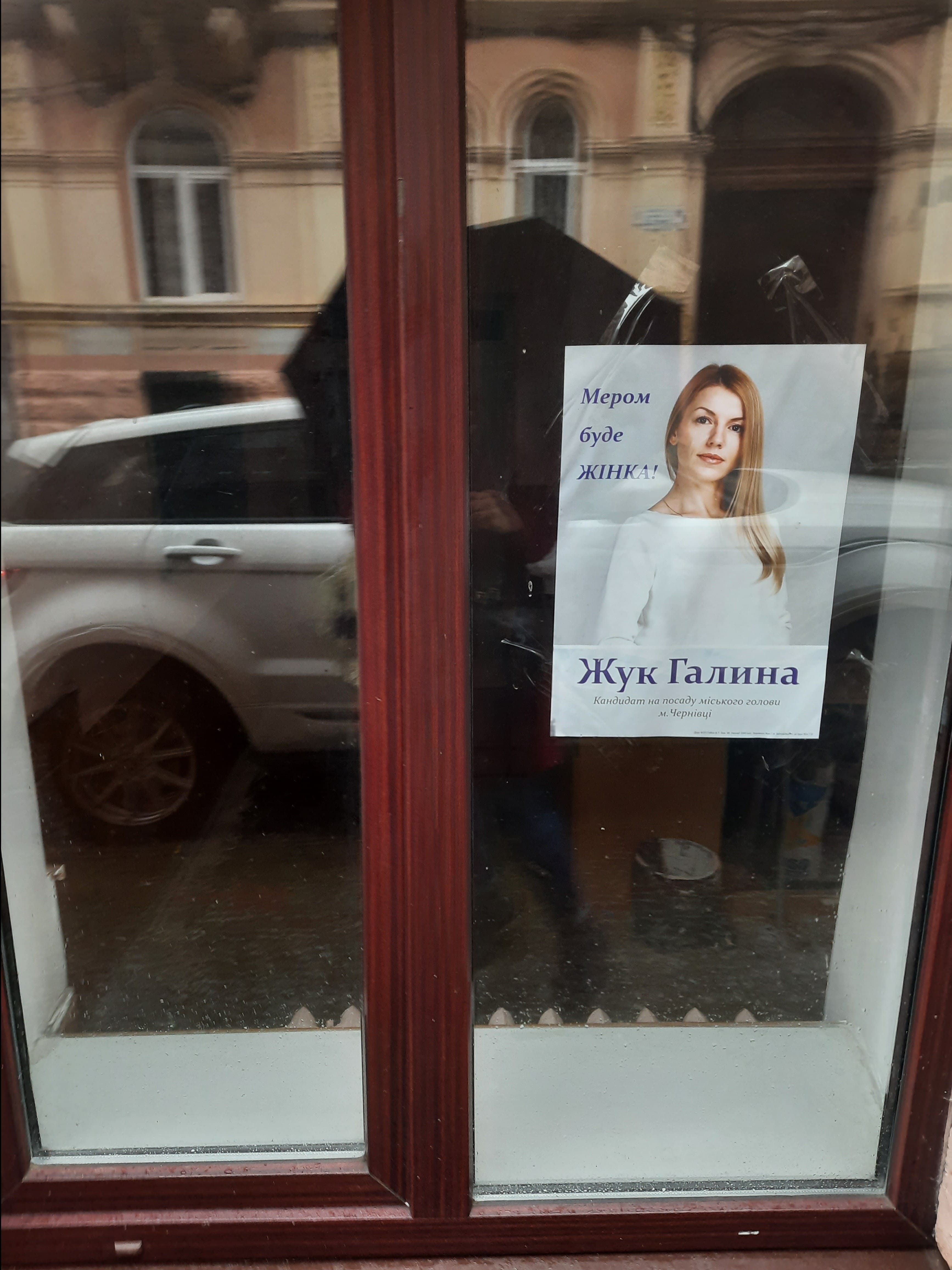 У четвер, 8 жовтня, спостерігач ОПОРИ зафіксував розміщення агітаційних матеріалів на користь кандидатки на посаду міської голови Чернівців Галини Жук. Плакати із зображенням кандидатки із зазначеним на них лозунгом “Мером буде жінка” зафіксовані на внутрішній частині вікна кабінету економіки №1 у Чернівецькому коледжі будівництва та архітектури Львівського аграрного університету, що на вулиці Олександра Доброго,4.