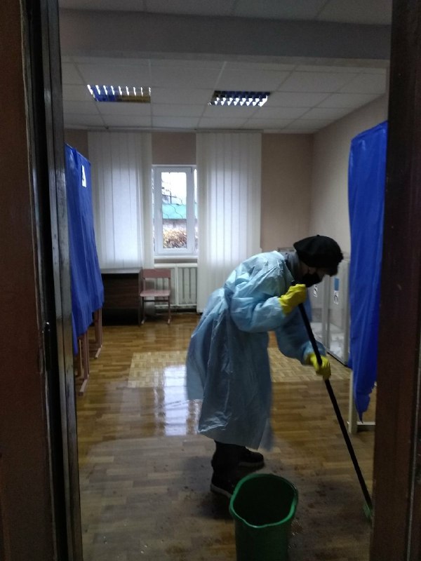 На цій дільниці також періодично проводиться дезінфекція. У цей час всі члени виборчої комісії покидають приміщення – там залишається лише прибиральниця.
