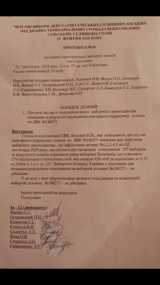 Фото протоколу засідання Ємільчинської ТВК на своїй сторінці у Facebook розмістив голова обласної організації Радикальної партії Олега Ляшка Сергій Крамаренко.