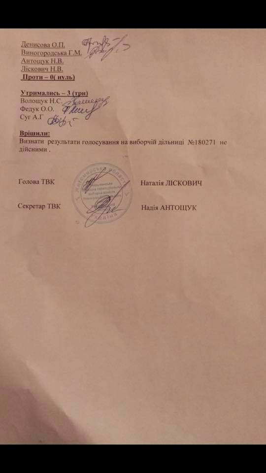 “На цій дільниці визнали результати виборів недійсними. Ще триває кримінальне провадження. Із загального протоколу відмінусуємо ці голоси. Ми ще чекаємо протокол від них, це одна така дільниця по всьому району і без них ми не можемо встановити результати виборів і оприлюднити все. Чекаємо їх ”, – каже голова ТВК.