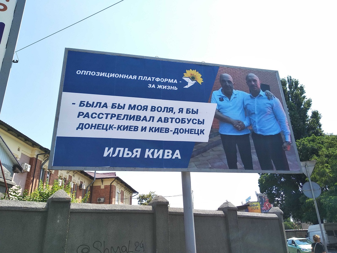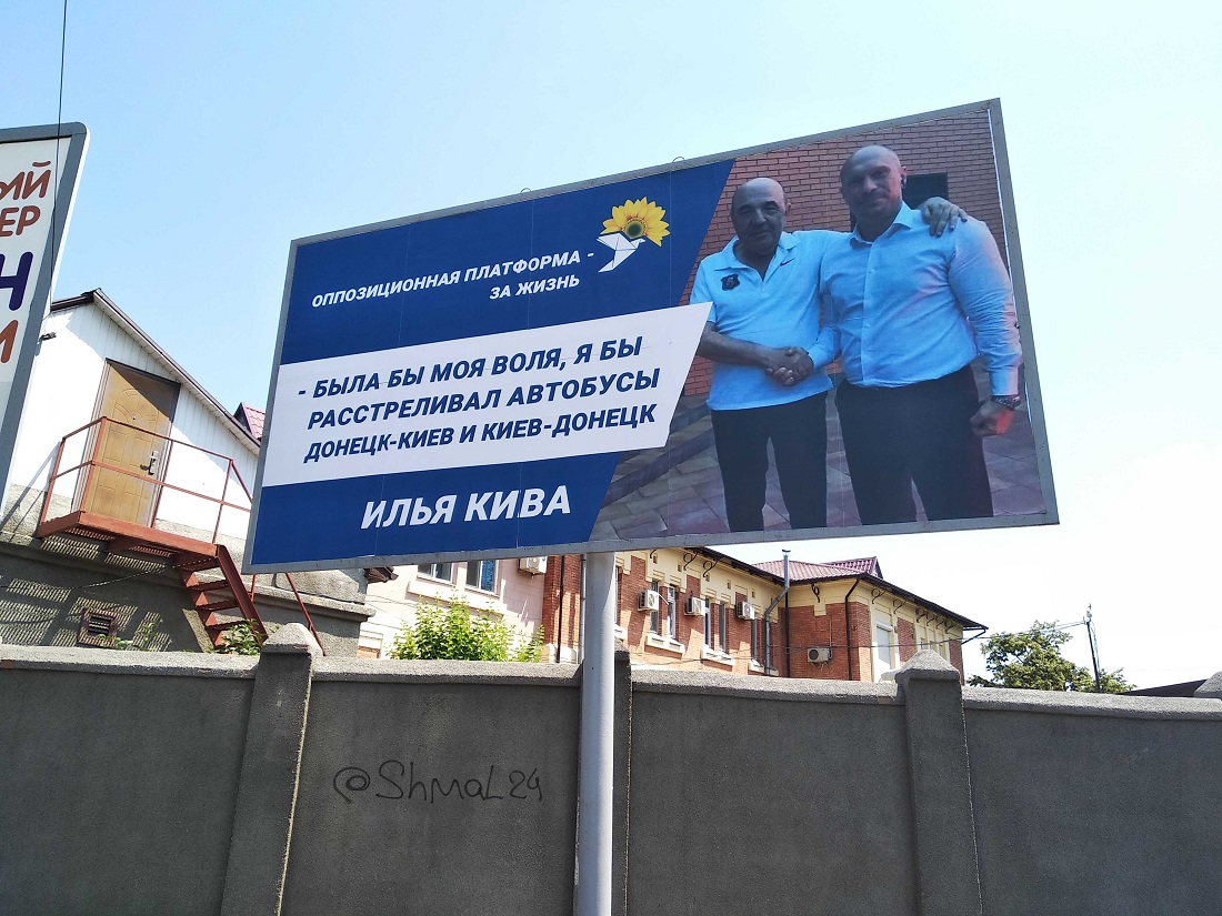 Білборди з’явилися вранці у різних районах міста. На них зображені представники партії Вадим Рабінович та Ілля Кива та є напис: «Була би моя воля – я б розстрілював автобуси Донецьк-Київ і Київ-Донецьк. Ілля Кива».