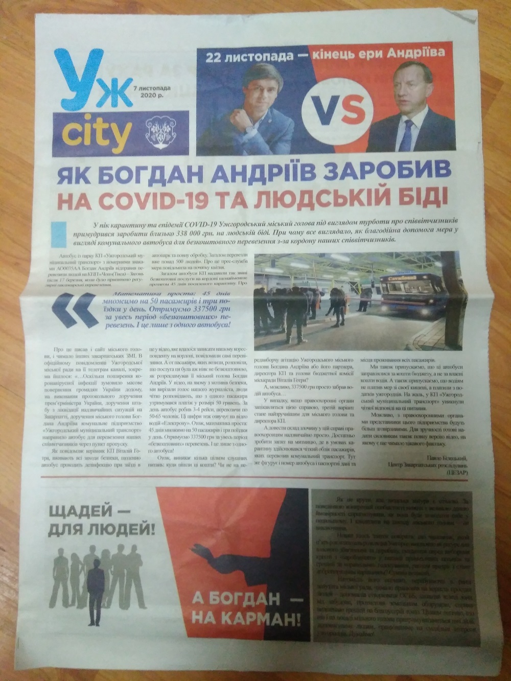 На вулицях Ужгорода перехожим роздавали листівку у вигляді газети із назвою “Ужcity”, яка містить ймовірно неправдиву та маніпулятивну інформацію про чинного міського голову Ужгорода Богдана Андріїва, кандидата-самовисуванця на цю ж посаду. На листівці відсутні вихідні дані - інформацію про замовника, тираж, друкарні тощо. Через це представники кандидата Богдана Андріїва звернулися до правоохоронців.