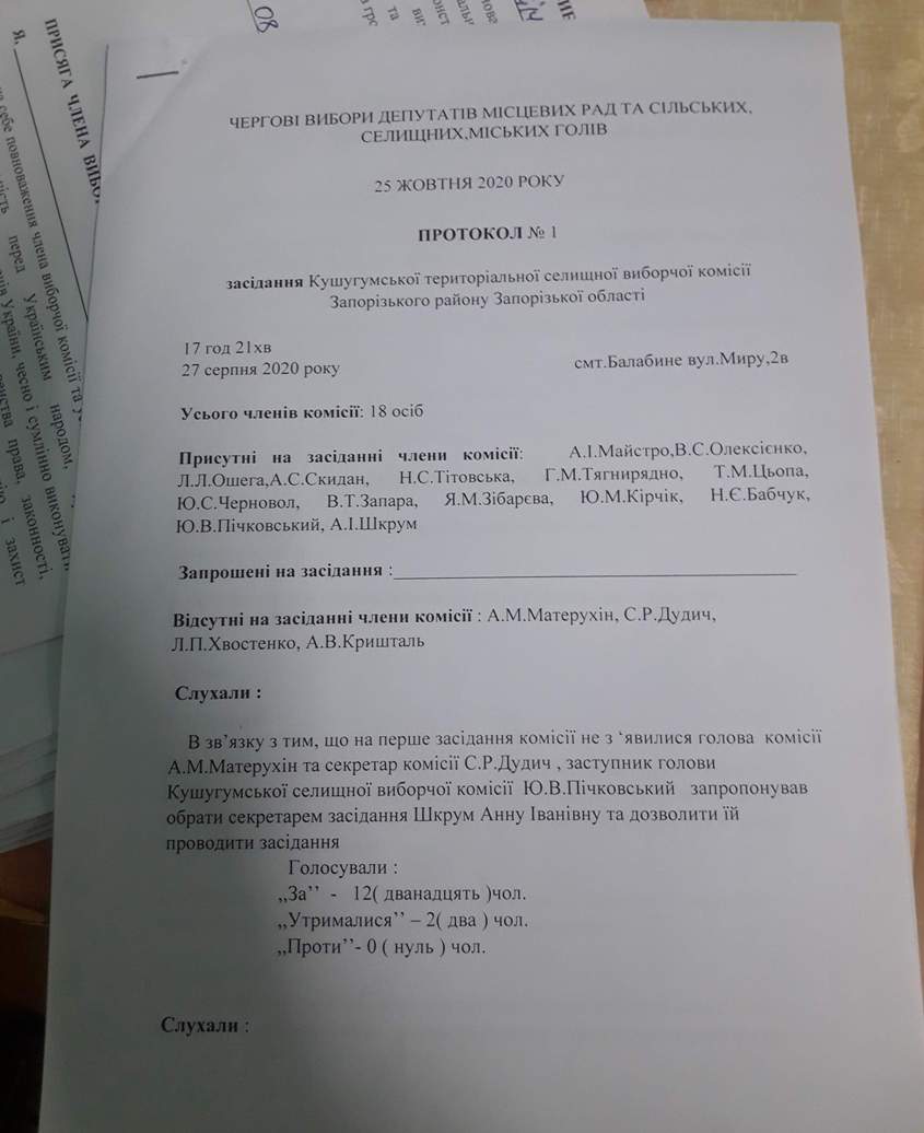 Варто додати, що можливі ознаки порушень та неточності у роботі Кушугумської територіальної селищної виборчої комісії Запорізького району Запорізької області ОПОРА фіксувала раніше. Зокрема, 27 серпня 2020 року ця комісія провела два перших засідання у різних місцях. Одне відбулося у Кушугумі, де присутні прийняли присягу, кворуму дотримано не було. Інше - в Балабине із дотриманням кворуму та прийняттям присяги. Залишається незакритим питання, ким скликались ці засідання. На обидвох засіданнях був присутнім та зазначений як член комісії чинний депутат Балабинської селищної ради Анатолій Майстро.