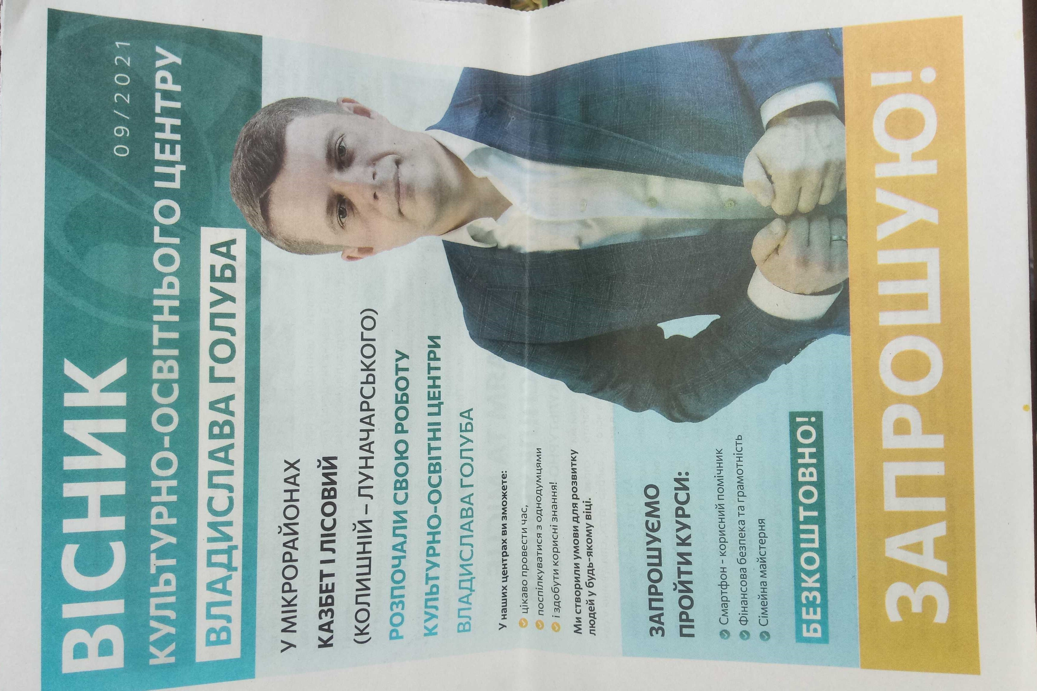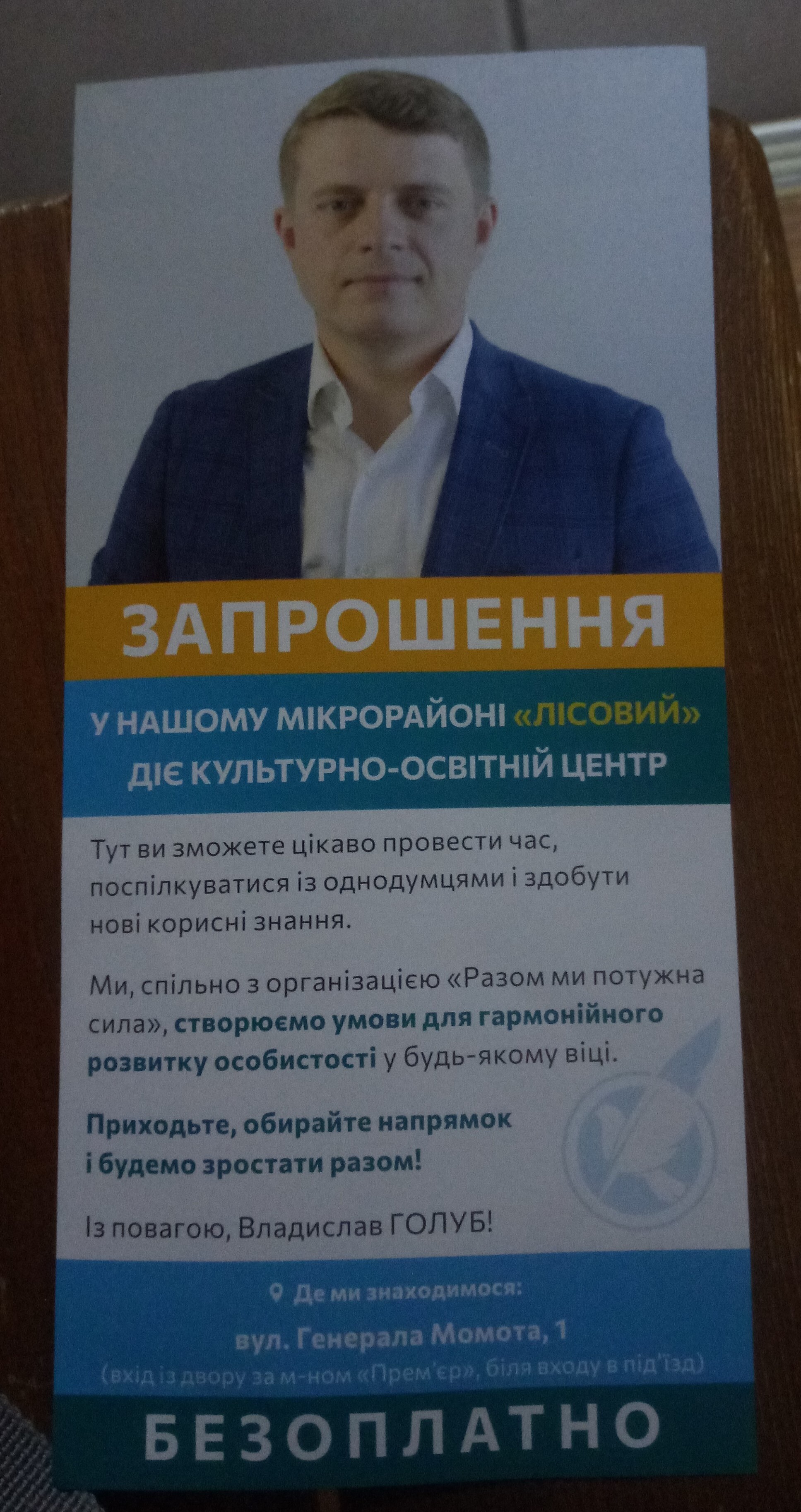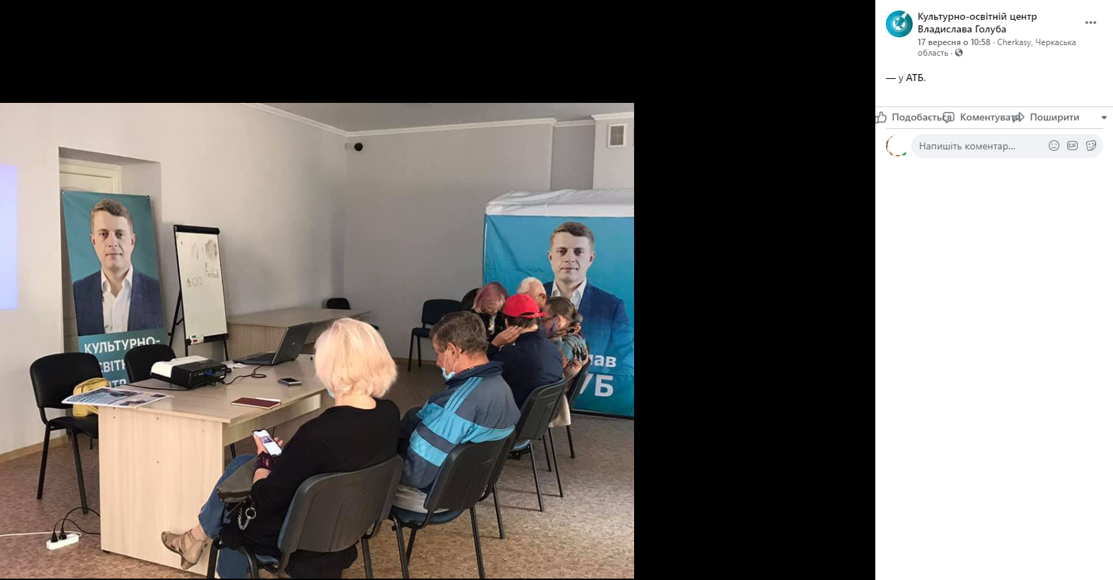 Також у два культурно-освітніх центрах Владислава Голуба відбуваються різноманітні навчальні курси. У приміщенні, де проводяться заходи розміщується банер із фотографією потенційного кандидата та конструкція схожа на намет, де також розміщено портрет Голуба. Спостерігачі ОПОРИ, які відвідали один із центрів, зафіксували, що під час навчальних тренінгів не здійснюється відкрита агітація.