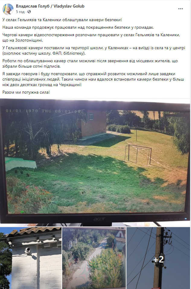 Також на власній сторінці у Facebook Владислава Голуба та на сторінці ГО «Разом ми потужна сила» розповідається про ініціативу зі встановлення відеокамер спостереження на школи населених пунктів округу за сприяння Голуба. Так, 20 вересня на сторінці Владислава Голуба йшлося про встановлення камер безпеки в селах Гельмязів та Каленики (входять до округу).