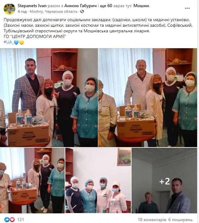 Ще один потенційний кандидат в окрузі депутат Черкаської районної ради попереднього скликання від ВО “Батьківщина”, кандидат до Київської обласної ради від партії “УДАР” на останніх місцевих виборах Іван Степанець в соціальній мережі Facebook 20 вересня повідомив про «допомогу» соціальним закладам (садочкам, школам) та медичним установам. Йшлося про передачу захисних масок, щитків, костюмів та медичних антисептичних засобів Софіївському, Тубільцівському старостинським округам та Мошнівській центральній лікарні. від ГО "Центр допомоги армії"». Відповідно до даних Youcontrol благодійна організація з такою назвою існувала з 2014 року, припинила свою діяльність в 2017 році, однак вже в 2019 році в Черкасах було зареєстровано громадську організацію під назвою "ЦЕНТР ДОПОМОГИ АРМІЇ, ВЕТЕРАНАМ ТА ЇХНІМ РОДИНАМ".