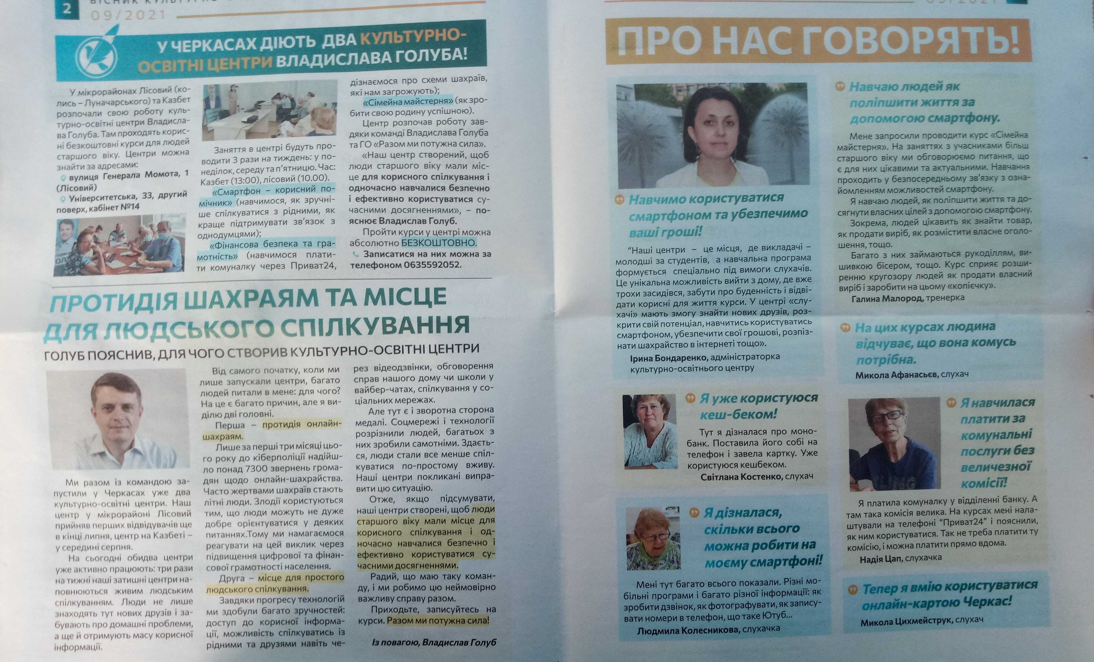До дня міста Черкаси 18 вересня від цих центрів відбулися дві вуличні акції для дітлахів мікрорайонів «Дахнівський» та «Лісовий», де розташовані виборчі дільниці ОВО № 197. Як зазначається у публікації Центру на сторінці в соціальній мережі Facebook, для дітей були проведені різного роду змагання, а «за результатами конкурсів та естафет, визначили щасливих власників справжніх футбольних м’ячів». На заходах дітям роздавали брендовані повітряні кульки із написом «Владислав Голуб», а фотографували дітей поруч із банером Центру, що також містить фотографію політика.