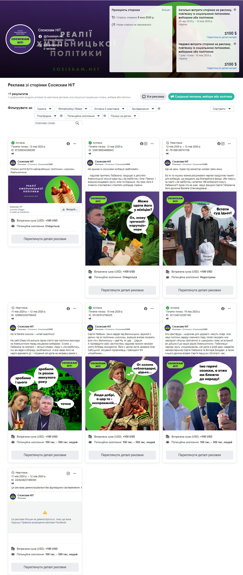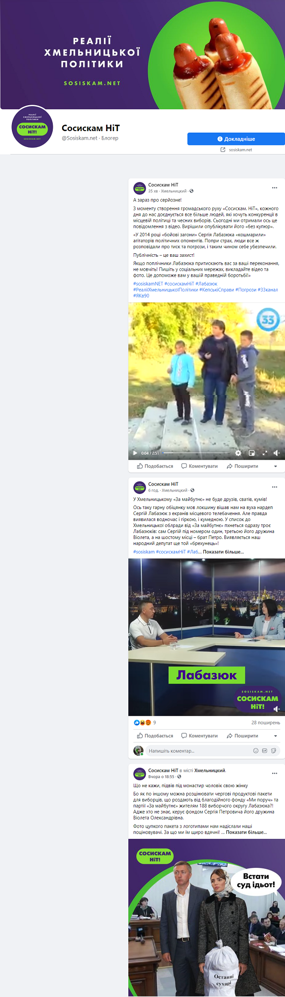З 10 жовтня у стрічці новин мешканців Хмельниччини з’явилася реклама сторінки «Сосискам НіТ», яка позиціонує себе як «літопис життя-буття найнахабніших політичних «сосисок» Хмельниччини». Зі сторінки, створеної 8 жовтня, поширюють інформацію, яка у негативному контексті висвітлює переважно діяльність народного депутата Сергія Лабазюка, який також є кандидатом у депутати на місцевих виборах.