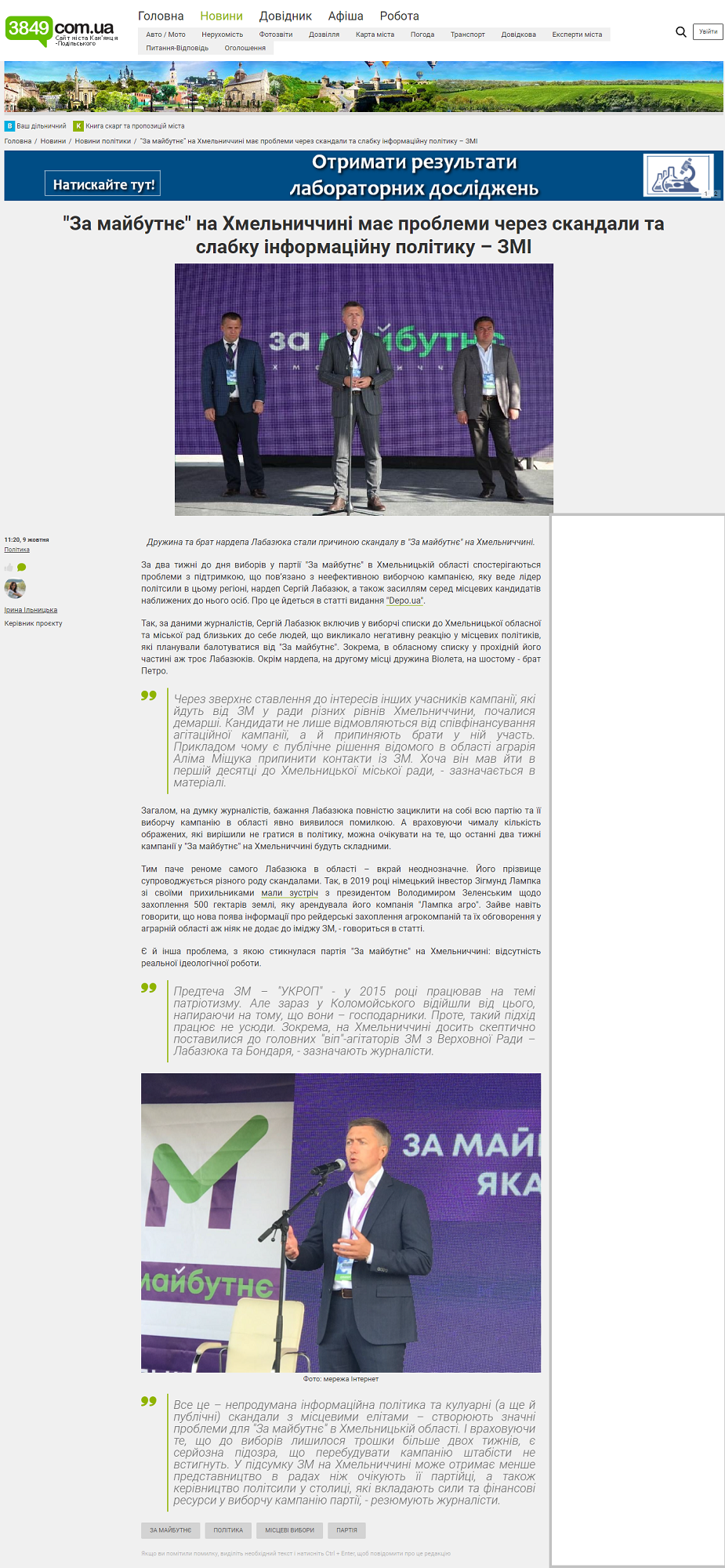 Цю цитату повторює також інше онлайн-видання, «0382.ua – Сайт міста Хмельницького», яке посилаючись на «Depo. Хмельницький», опублікувало текст «На Хмельниччині «За майбутнє» не росте через скандали та слабку інформаційну політику – ЗМІ». Про «неоднозначне реноме Лабазюка», з посиланням на «Depo.ua», написали і видання «Gazeta.ua» та «3849.com.ua – Сайт міста Кам’янця-Подільського» в публікаціях з однаковою назвою – «За майбутнє» на Хмельниччині має проблеми через скандали та слабку інформаційну політику – ЗМІ». Проте поширення у різних ЗМІ однакових матеріалів нерідко свідчить про їх замовний характер. До того ж публікації з критикою на адресу кандидатів та партій в період виборчої кампанії можна зараховувати до матеріалів з ознаками контрагітації, тож вони мають бути належним чином марковані.