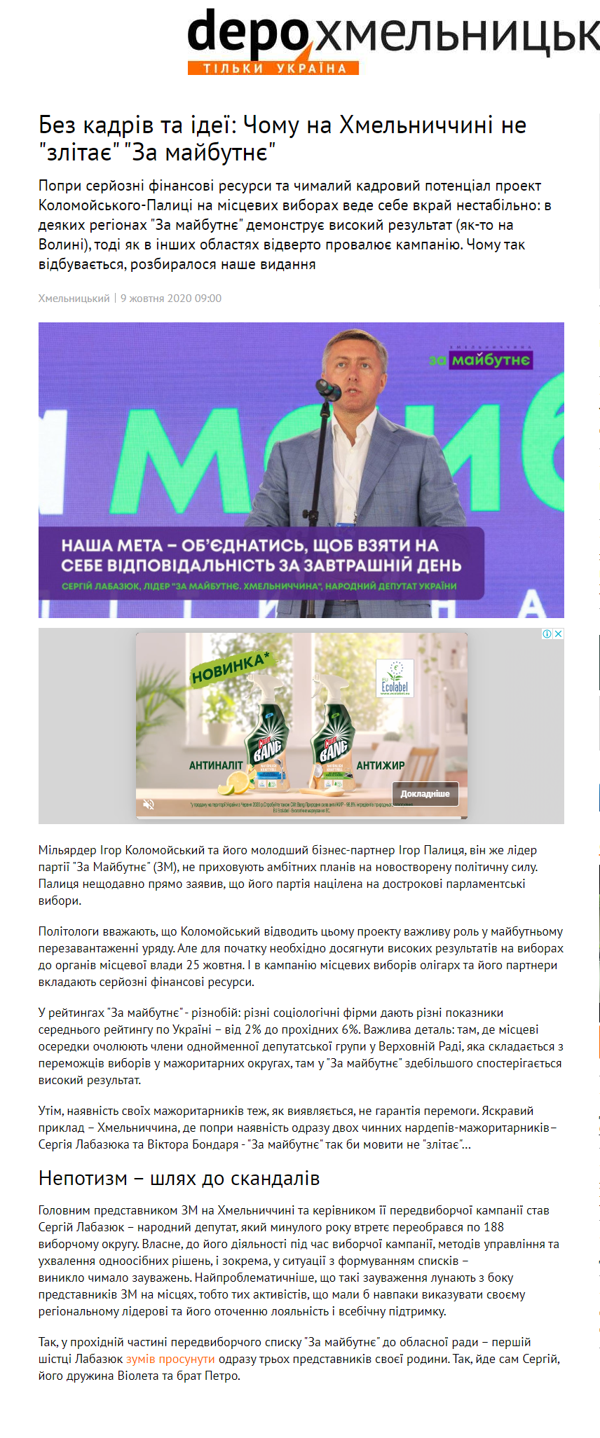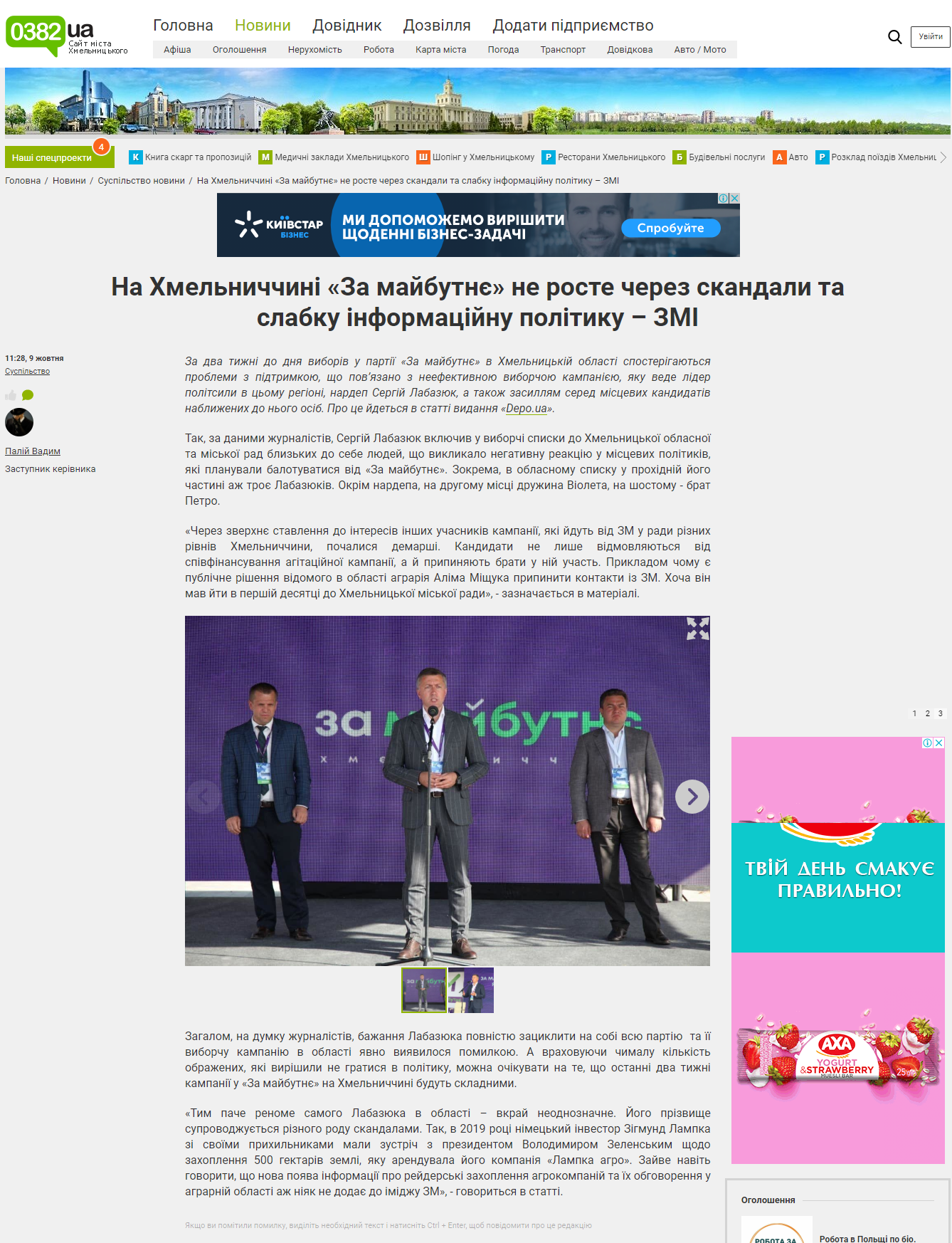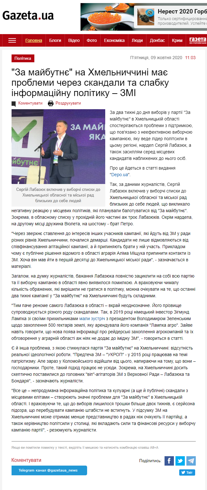 У одному з дописів на сторінці «Сосискам НіТ» поширюють посилання на публікацію «Без кадрів та ідеї: Чому на Хмельниччині не «злітає «За майбутнє», що з’явилася 9 жовтня у виданні «Depo. Хмельницький». Автор матеріалу критикує як діяльність партії в області загалом, так і одного з лідерів обласного осередку цієї політичної сили Сергія Лабазюка, зазначаючи, зокрема, що «реноме самого Лабазюка в області – вкрай неоднозначне. Його прізвище супроводжується різного роду скандалами».