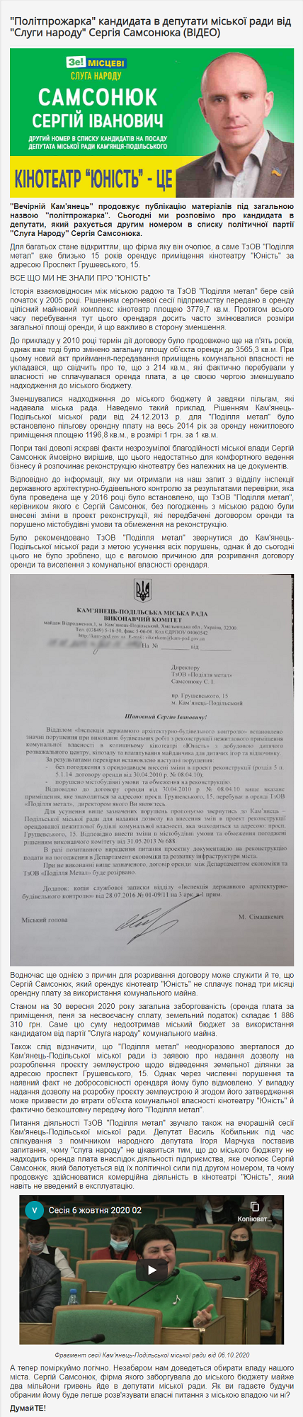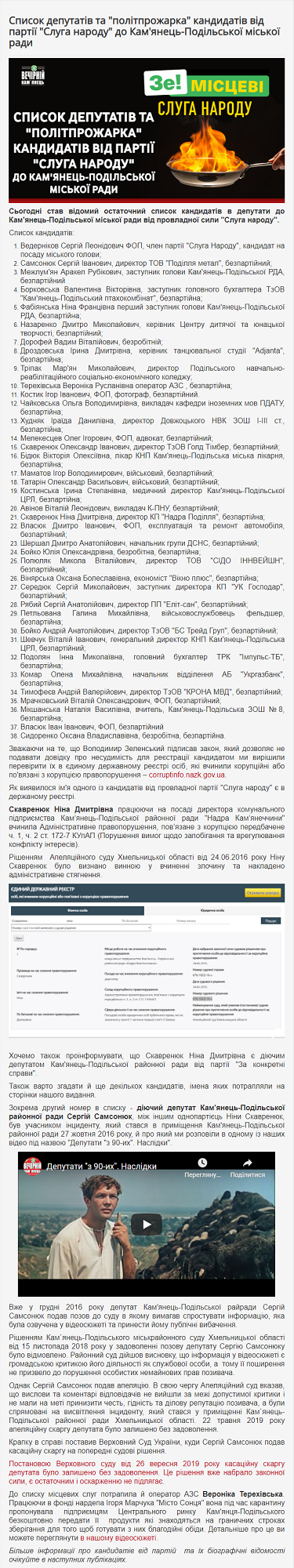 Героями усіх матеріалів є висуванці партії «Слуга народу», а факти, які наводять в текстах та відео, здебільшого характеризують їх негативно. До прикладу, матеріал про Сергія Самсонюка завершують такими словами: «А тепер поміркуймо логічно. Незабаром нам доведеться обирати владу нашого міста. Сергій Самсонюк, фірма якого заборгувала до міського бюджету майже два мільйони гривень йде в депутати міської ради. Як ви гадаєте будучи обраним йому буде легше розв'язувати власні питання з міською владою чи ні? ДумайТЕ!».