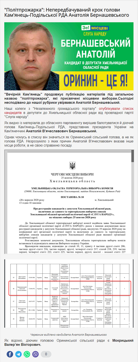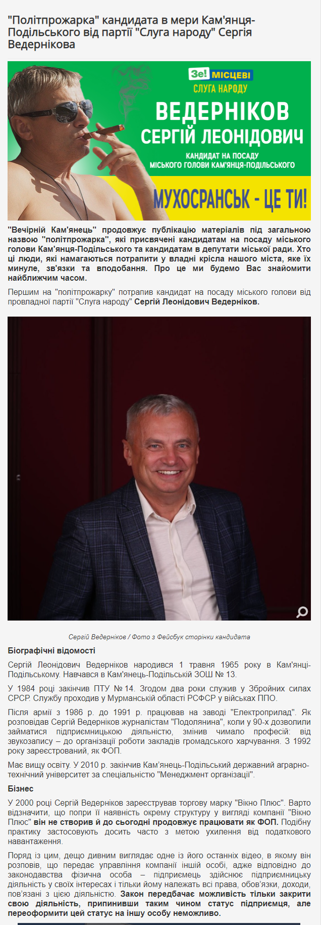У Кам’янці-Подільському видання «Вечірній Кам’янець» публікує матеріали під загальною назвою «Політпрожарка». Як свідчить пошук на сайті, наразі оприлюднили 4 таких публікації: «Список депутатів та «політпрожарка» кандидатів від партії «Слуга народу» до Кам'янець-Подільської міської ради» (від 24 вересня 2020 року), «Політпрожарка» кандидата в мери Кам'янця-Подільського від партії «Слуга народу» Сергія Ведернікова» (від 28 вересня 2020 року), «Політпрожарка»: Непередбачуваний крок голови Кам'янець-Подільської РДА Анатолія Бернашевського» (від 29 вересня 2020 року), «Політпрожарка» кандидата в депутати міської ради від «Слуги народу» Сергія Самсонюка» (від 7 жовтня 2020 року).