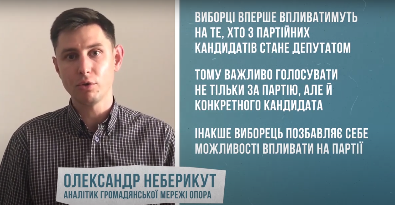 «Можна не проголосувати за кандидата, голос все одно буде дійсним. Він відійде партії, але виборець позбавляє себе пливу на проходження конкретних кандидатів від цієї партії, – пояснює аналітик Громадянської мережі ОПОРА Олександр Неберикут. – Тому дуже важливо обирати конкретного кандидата від партій. А він буде не один чи два, як було в 2015 році, коли кандидати були закріплені за округами. Це буде список мінімум з п’яти, а максимум з дванадцяти кандидатів від кожної партії. Саме з такого переліку виборець може обирати для себе кандидата. Тому дуже важливо голосувати не лише за партію, а й за окремого кандидата. Адже у виборців є два способи впливати на партію. Перший спосіб – це самим створювати партії, балотуватися і перемагати. Але зараз, коли дізналися про нову виборчу систему, це далеко від реальності, адже за два місяці складно створити партію, пройти всі процедури і наростити рейтинг. Тому інший спосіб – це впливати на партії через голосування, обираючи не лише партію, а й конкретного кандидата».