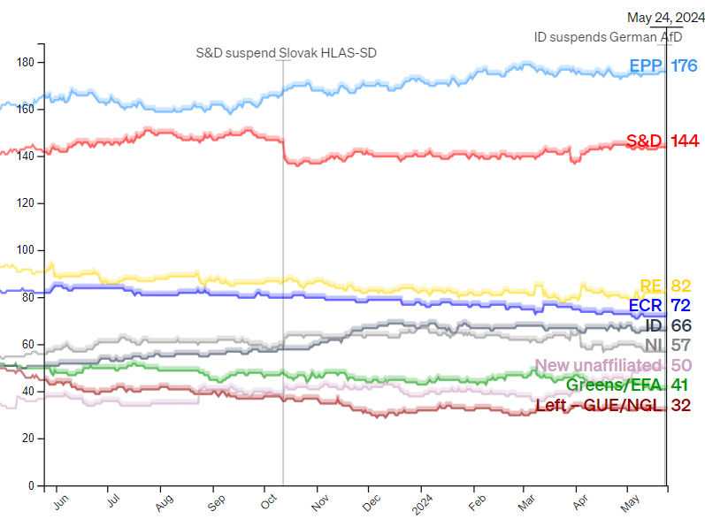 За два тижні до дня голосування ситуація для Європейської народної партії й "Альянсу соціалістів і демократів" не настільки оптимістична, як у попередні скликання. За даними соціологічних опитувань, ЄНП може розраховувати орієнтовно на 174 депутатські мандати (на 13 менше, аніж у поточному скликанні), тоді як "Альянс соціалісті і демократів" — орієнтовно на 144 місця (на 3 менше, ніж зараз). Сумарно вони контролюватимуть приблизно на 16-20 місць менше. Навіть зараз вони не можуть обійтися без підтримки інших груп — "За оновлену Європу", яка також суттєво втратись представництво з наявних 98 депутатів до близько 85, або, менш ймовірно, групи "Зелені / Європейський вільний альянс", для яких результати цьогорічних виборів будуть катастрофічними 43 — замість 76 мандатів (тобто вони втратять близько 40% місць).