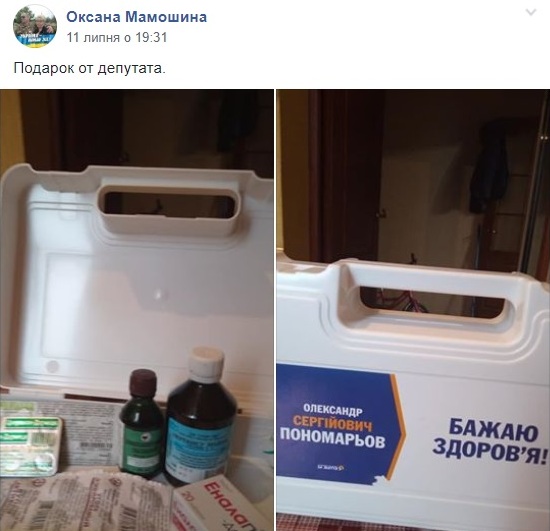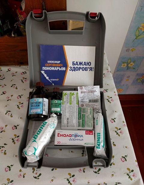 ОПОРА вже повідомляла про ініціативу кандидата в нардепи Олександра Пономарьова з виїздів лікарів до селищ Бердянського району Запорізької області для безкоштовного медичного огляду місцевих жителів. 16 липня до спостерігачів звернулася жінка, яка просила не згадувати її імені в публікації. Вона надала світлину аптечки із агітаційними наліпками за цього кандидата і сповістила: