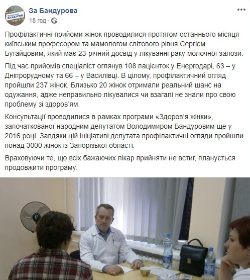 15 липня Facebook-сторінка «За Бандурова» розповіла про профілактичні прийоми жінок київським мамологом Сергієм Бугайцовим в містах Енергодар, Дніпрорудне, Василівка. Сповіщалося, що консультації проводилися в рамках програми «Здоров’я жінки», започаткованої чинним народним депутатом та кандидатом в нардепи Володимиром Бандуровим.